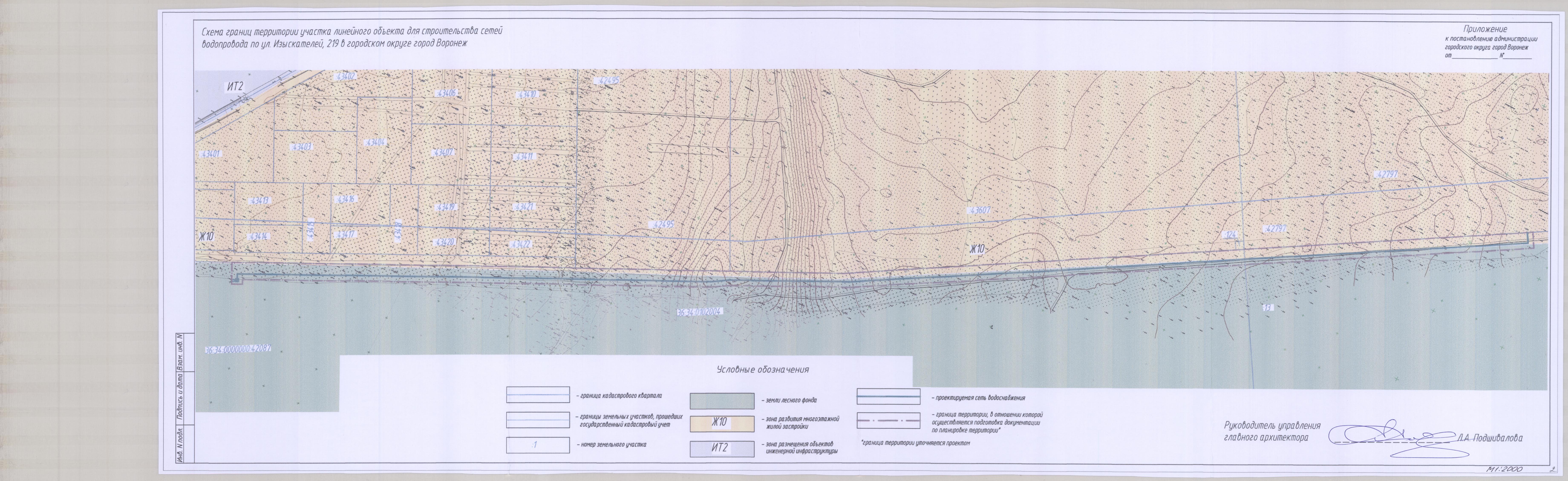 2.1. Подготовить в соответствии с утвержденным заданием документацию по планировке территории участка линейного объекта для строительства сетей водопровода по ул. Изыскателей, 219 в городском округе город Воронеж согласно прилагаемой схеме.