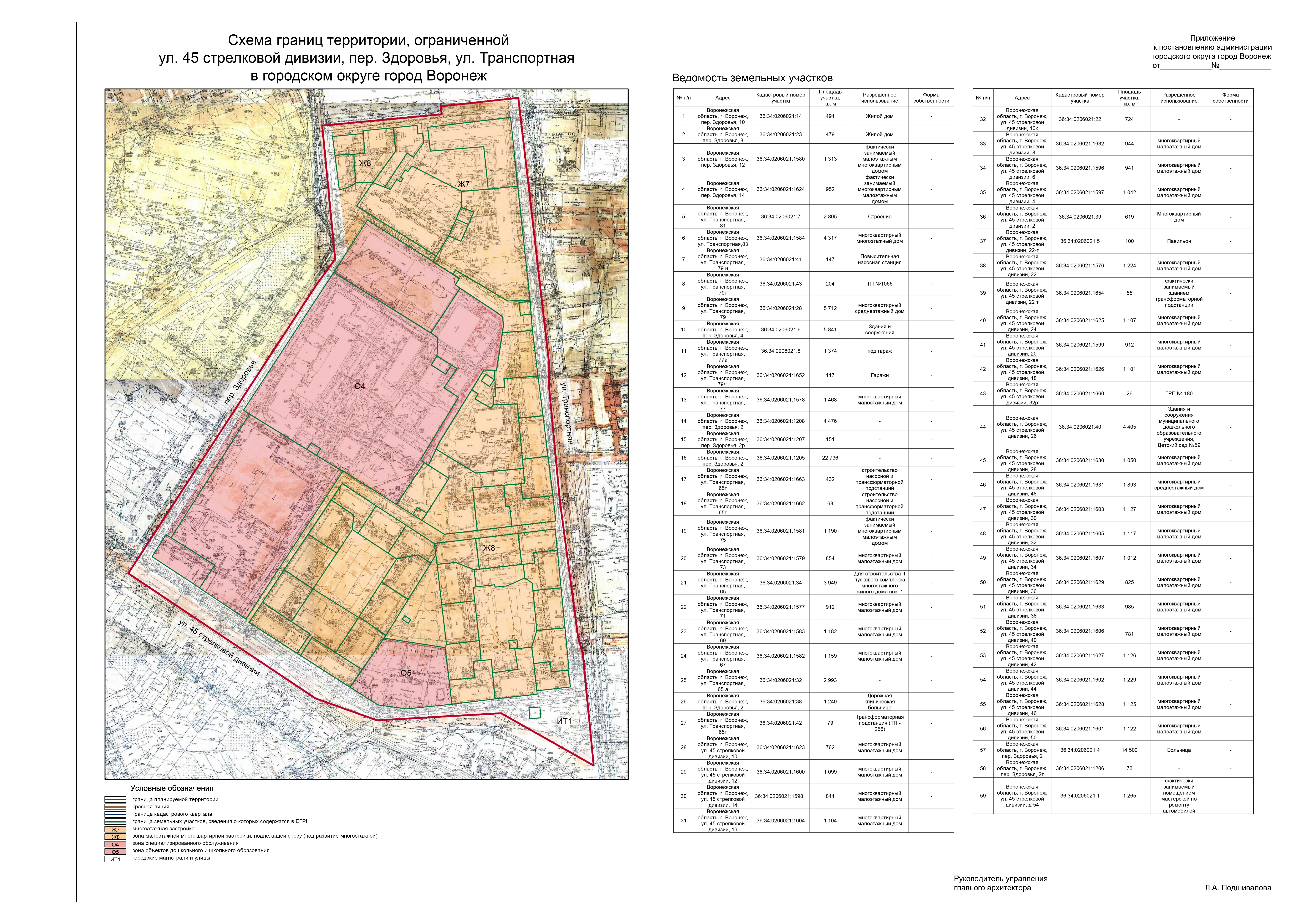 2.2. Обеспечить подготовку в соответствии с утвержденным заданием документации по планировке территории, ограниченной ул. 45 стрелковой дивизии, пер. Здоровья, ул. Транспортная в городском округе город Воронеж, согласно прилагаемой схеме.