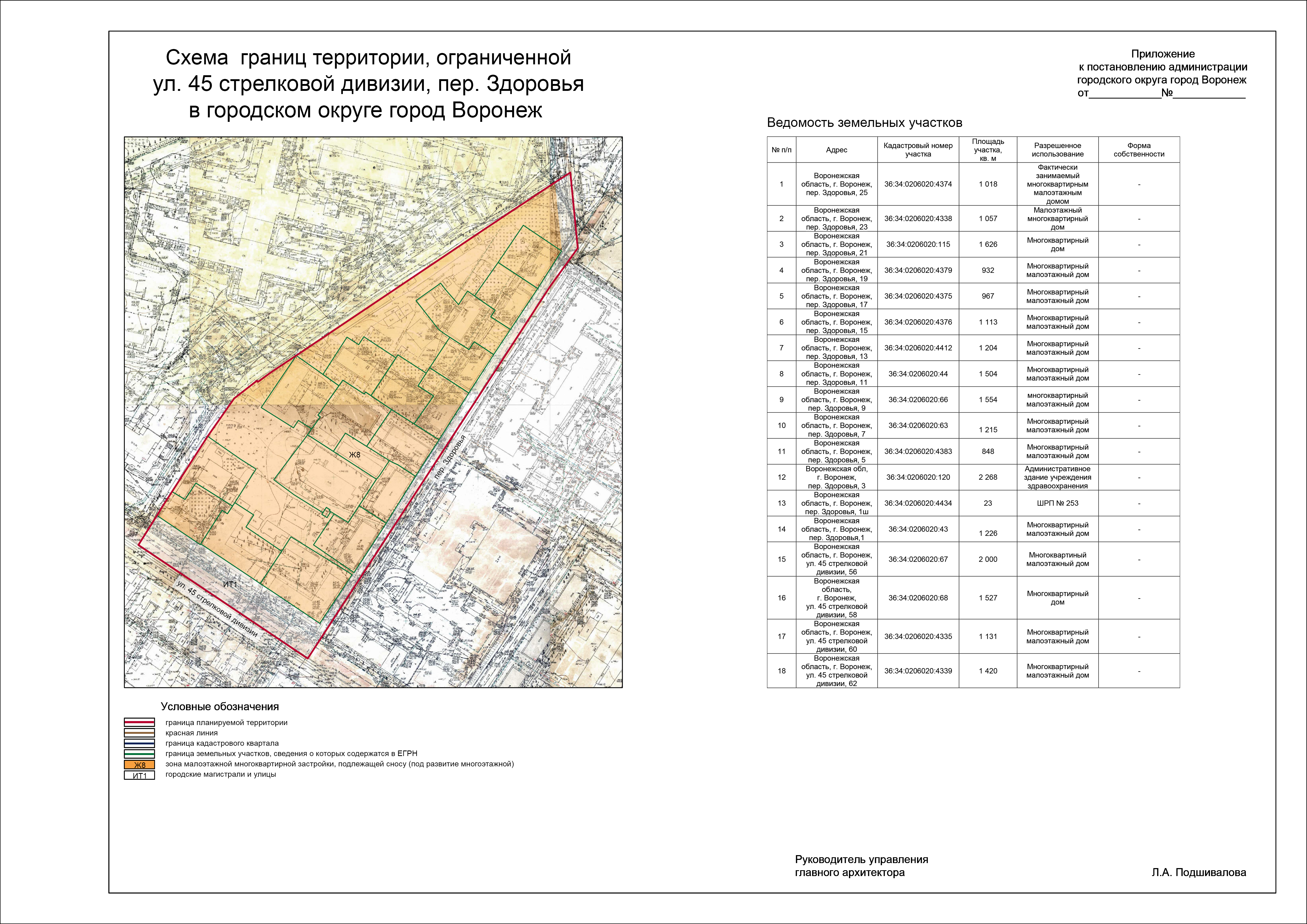 2.2. Обеспечить подготовку в соответствии с утвержденным заданием документации по планировке территории, ограниченной ул. 45 стрелковой дивизии, пер. Здоровья в городском округе город Воронеж, согласно прилагаемой схеме.