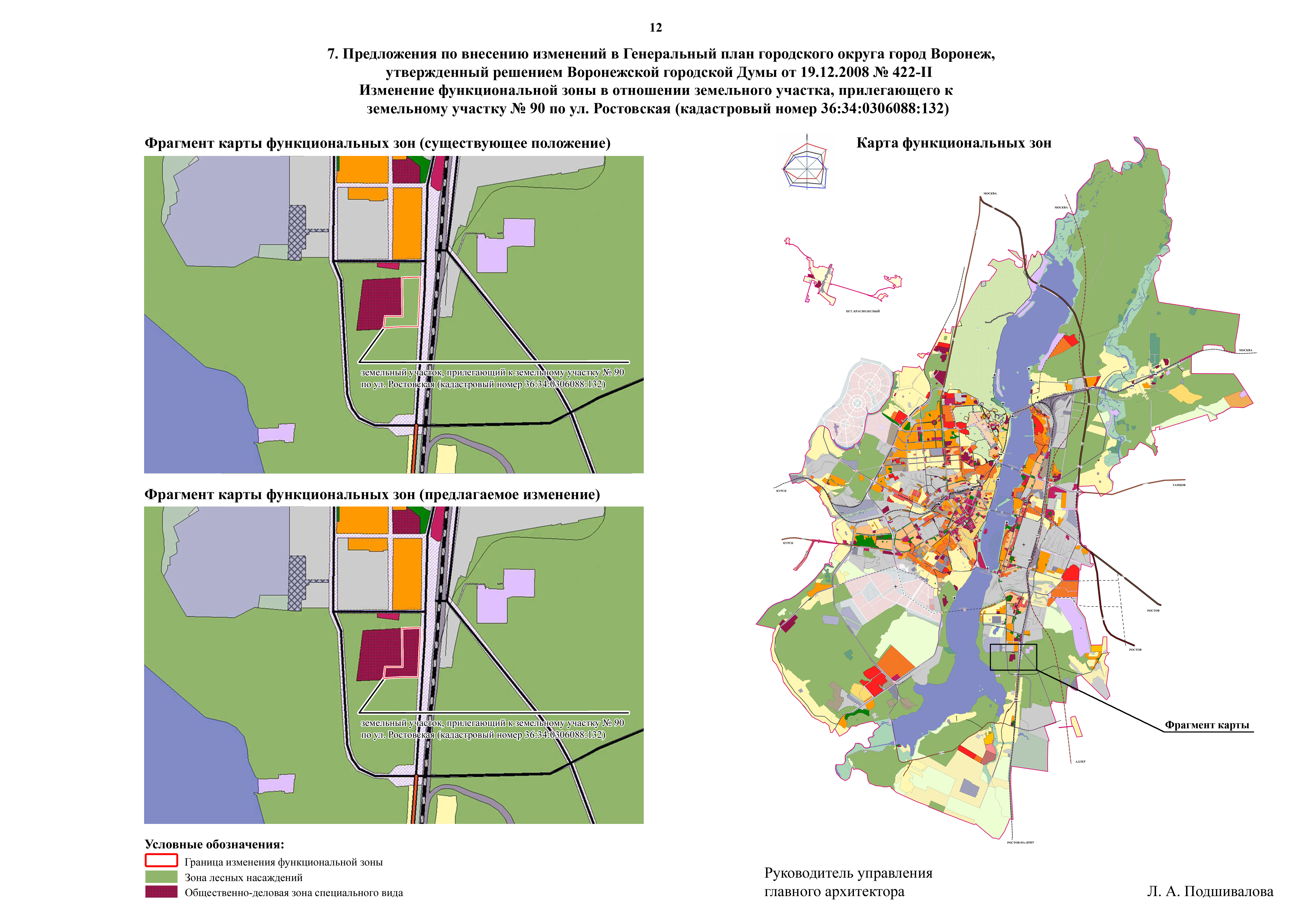 - - по проекту внесения изменений в Генеральный план городского округа город Воронеж в части установления функциональной общественно-деловой зоны специального вида в отношении земельного участка, прилегающего к земельному участку № 90 по ул. Ростовская (кадастровый номер 36:34:0306088:132);