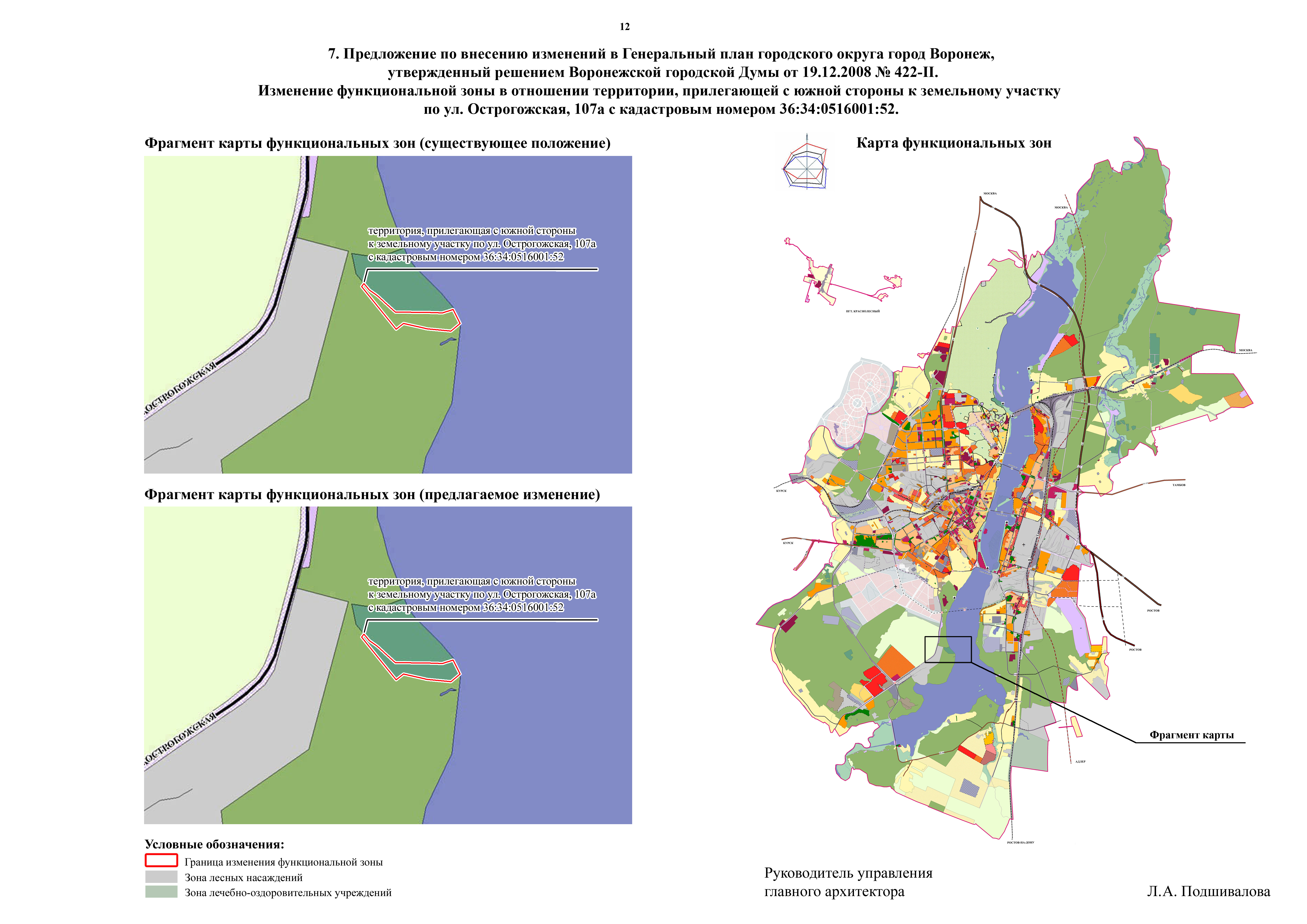 - по проекту внесения изменений в Генеральный план городского округа город Воронеж в части установления функциональной зоны лечебно-оздоровительных учреждений в отношении территории, прилегающей с южной стороны к земельному участку по ул. Острогожская, 107а с кадастровым номером 36:34:0516001:52;