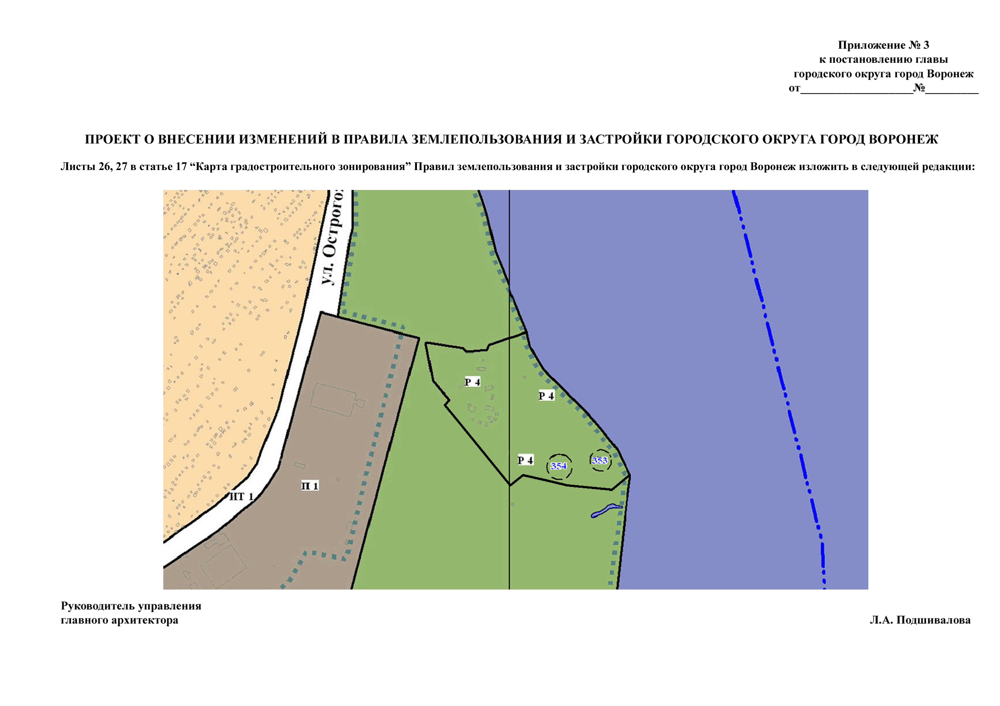 - по проекту о внесении изменений в Правила землепользования и застройки городского округа город Воронеж в части установления территориальной зоны Р 4 «Зона лечебно-оздоровительных учреждений» в отношении территории, прилегающей к земельному участку по ул. Острогожская, 107а с кадастровым номером 36:34:0516001:52.