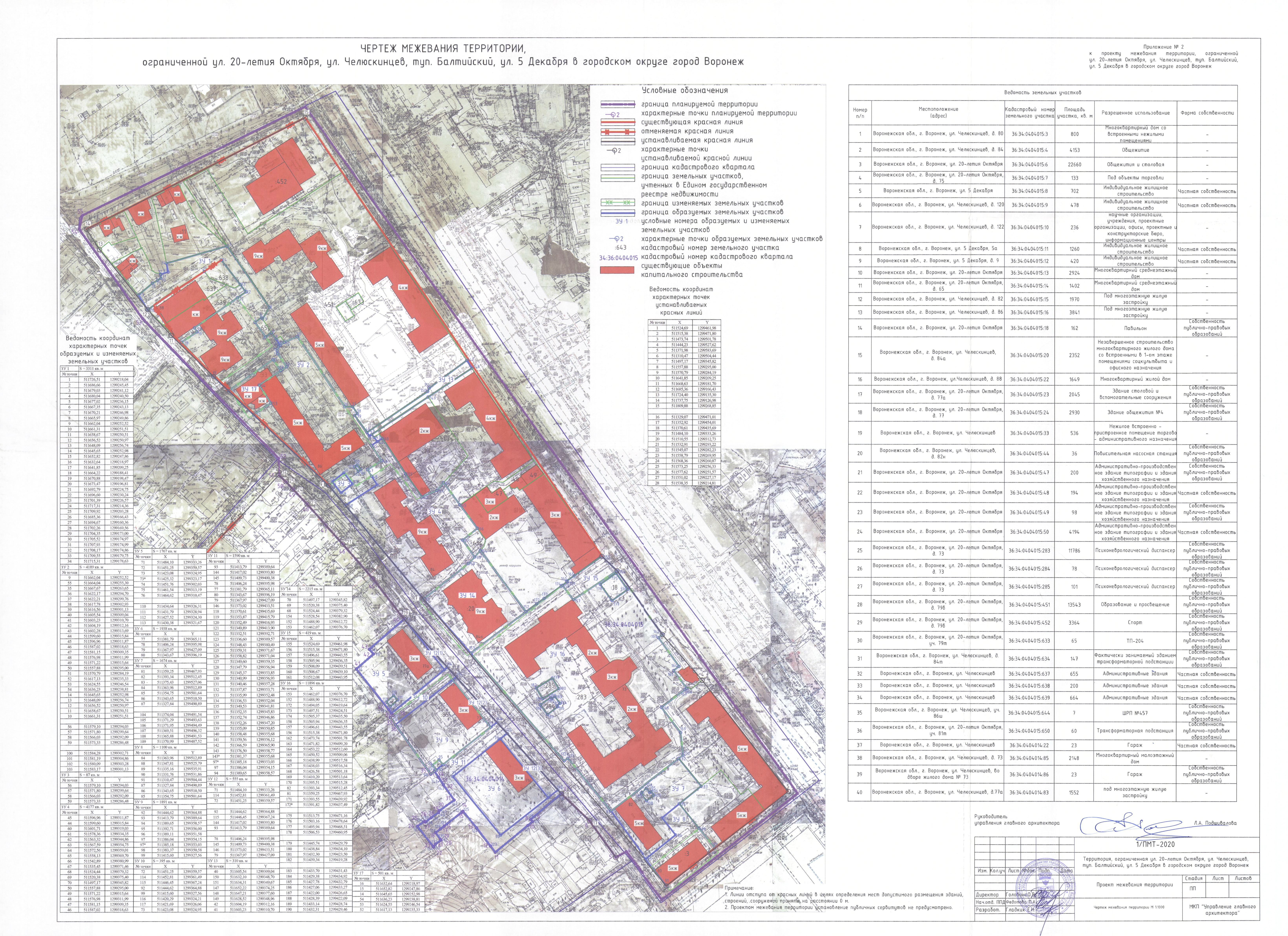 В целях реализации Генерального плана городского округа город Воронеж, утвержденного решением Воронежской городской Думы от 19.12.2008 № 422-II «Об утверждении Генерального плана городского округа город Воронеж», положений Жилищного кодекса Российской Федерации, образования земельных участков, на которых расположены многоквартирные дома и иные входящие в состав таких домов объекты недвижимого имущества, не образованных до введения в действие Жилищного кодекса Российской Федерации, на основании статьи 16 Федерального закона от 29.12.2004 № 189-ФЗ «О введении в действие Жилищного кодекса Российской Федерации», решения Воронежской городской Думы от 08.07.2011 № 501-III «О порядке подготовки документации по планировке территории, разрабатываемой на основании решений органов местного самоуправления городского округа город Воронеж», на основании постановления администрации городского округа город Воронеж от 10.02.2020 № 79 «О подготовке проекта межевания территории, ограниченной ул. 20-летия Октября, ул. Челюскинцев, туп. Балтийский, ул. 5 Декабря в городском округе город Воронеж», Правил землепользования и застройки городского округа город Воронеж, утвержденных решением Воронежской городской Думы от 25.12.2009 № 384-II «Об утверждении Правил землепользования и застройки городского округа город Воронеж», в соответствии со статьями 45, 46 Градостроительного кодекса Российской Федерации, статьей 28 Федерального закона от 06.10.2003 № 131-ФЗ «Об общих принципах организации местного самоуправления в Российской Федерации», статьей 46 Устава городского округа город Воронеж, принятого постановлением Воронежской городской Думы от 27.10.2004 № 150-I «Об Уставе городского округа город Воронеж», Положением о порядке организации и проведения публичных слушаний или общественных обсуждений по вопросам градостроительной деятельности в городском округе город Воронеж, утвержденным решением Воронежской городской Думы от 27.05.2020 № 1430-IV «Об утверждении Положения о порядке организации и проведения публичных слушаний или общественных обсуждений по вопросам градостроительной деятельности в городском округе город Воронеж», глава городского округа город Воронеж постановляет: