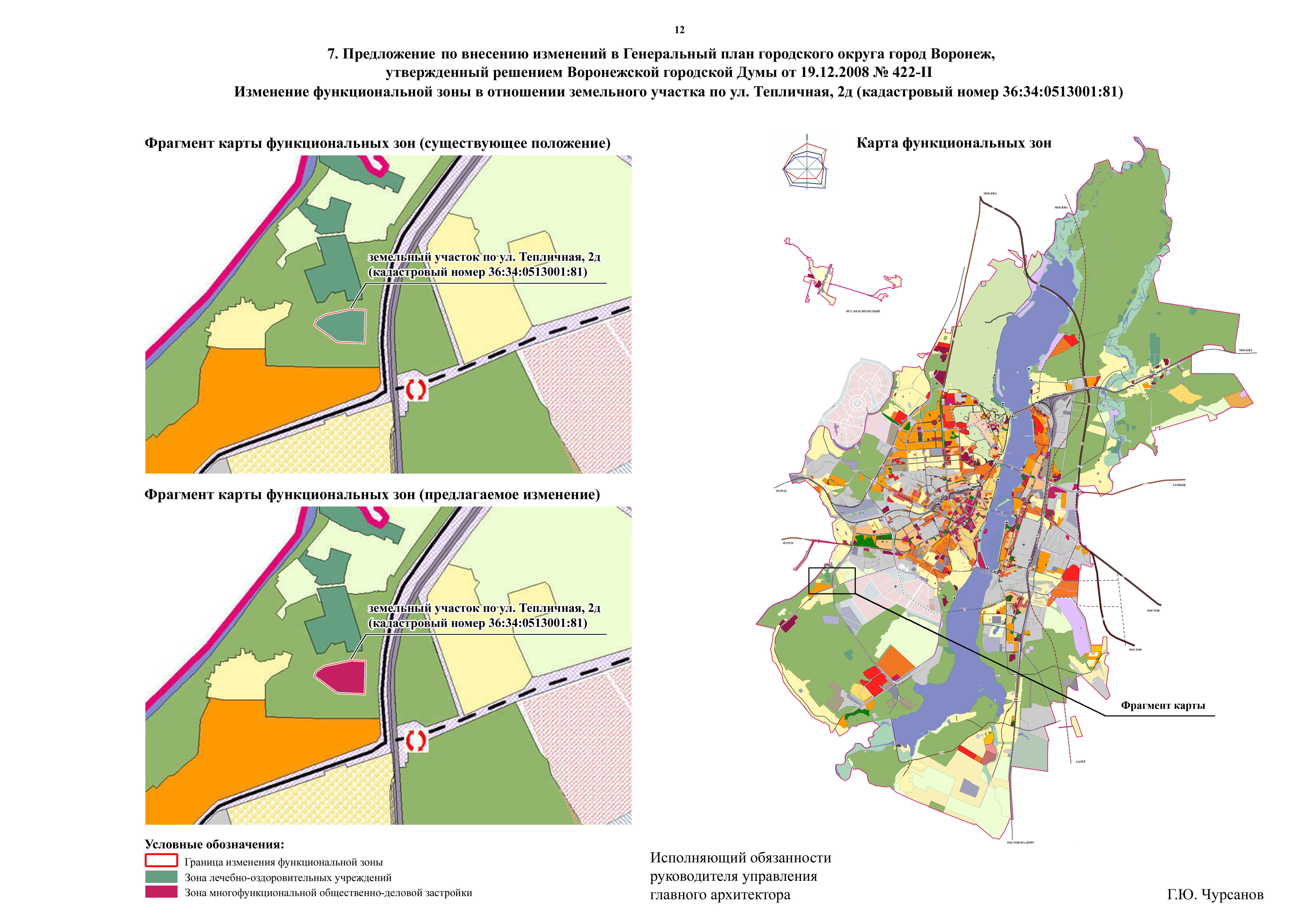 - по проекту внесения изменений в Генеральный план городского округа город Воронеж в части изменения функциональной зоны лечебно-оздоровительных учреждений на зону многофункциональной общественно-деловой застройки в отношении земельного участка по ул. Тепличная, 2д (кадастровый номер 36:34:0513001:81);
