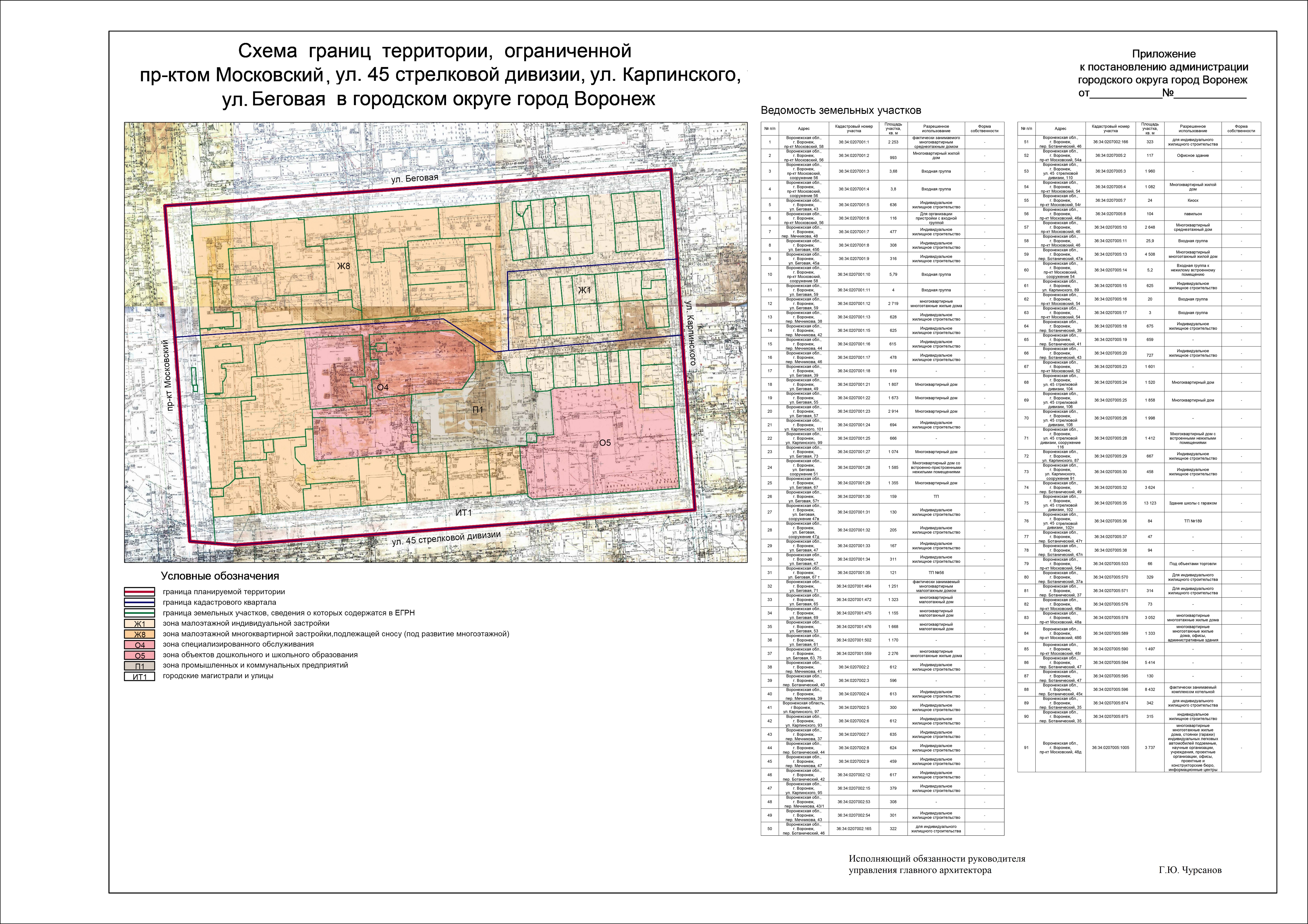 2.2. Обеспечить подготовку в соответствии с утвержденным заданием документации по планировке территории, ограниченной пр-ктом Московский, ул. 45 стрелковой дивизии, ул. Карпинского, ул. Беговая в городском округе город Воронеж, согласно прилагаемой схеме.