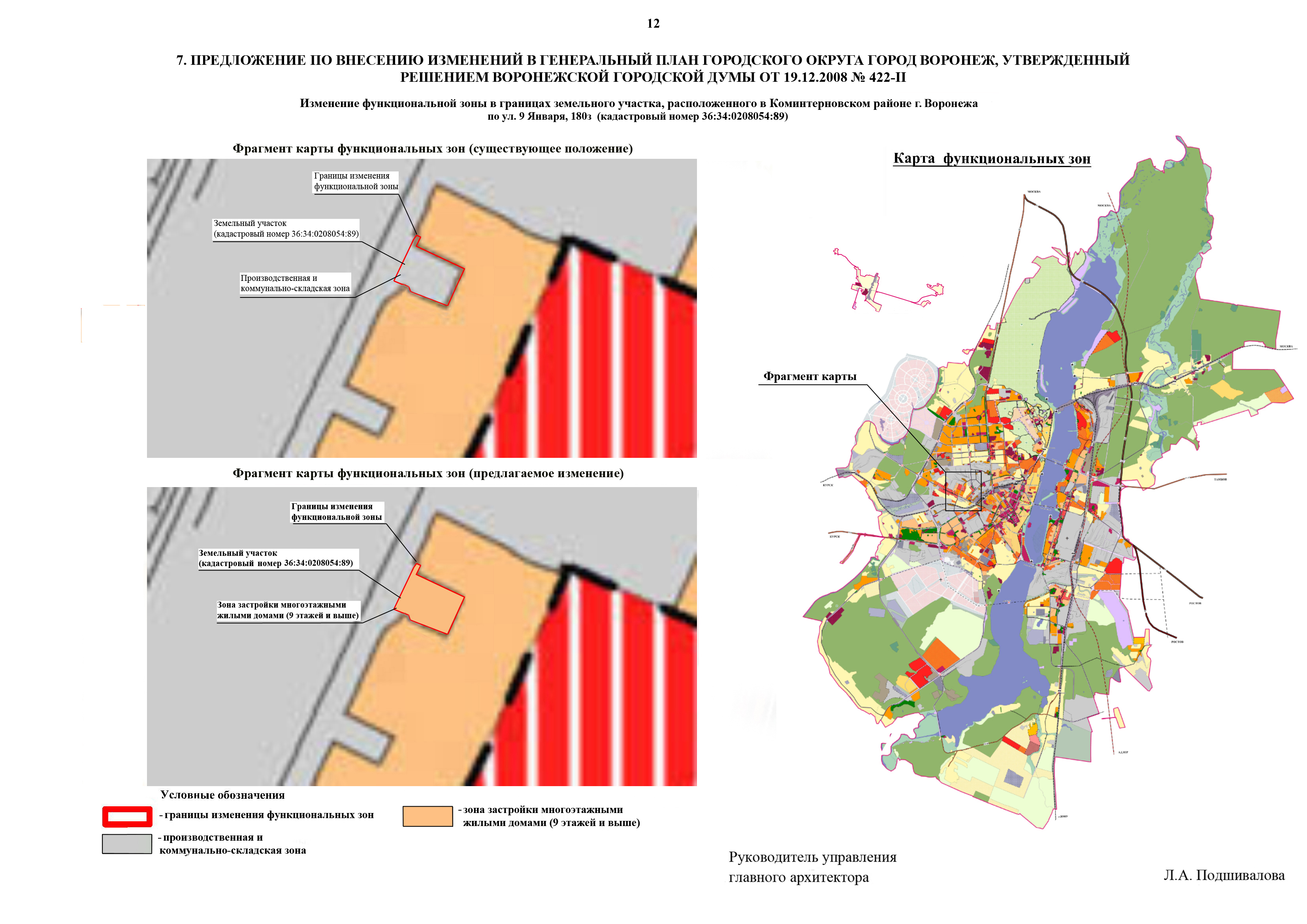 - - по проекту внесения изменений в Генеральный план городского округа город Воронеж в части изменения функциональной производственной и коммунально-складской зоны на функциональную зону застройки многоэтажными жилыми домами (9 этажей и выше) для земельного участка по ул. 9 Января, 180з (кадастровый номер 36:34:0208054:89).