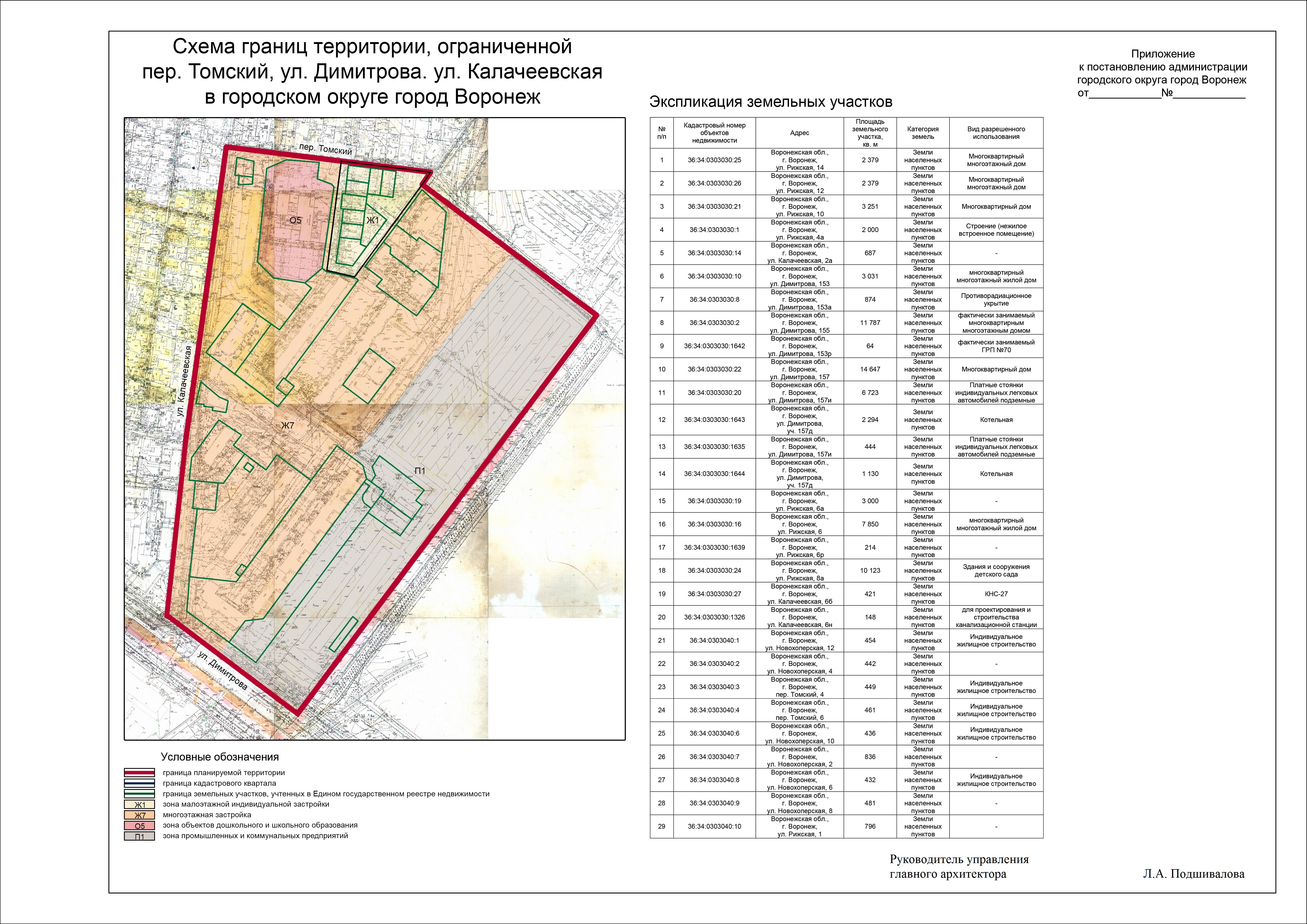 1. Утвердить прилагаемое задание на подготовку документации по планировке территории, ограниченной пер. Томский, ул. Димитрова, ул. Калачеевская в городском округе город Воронеж.