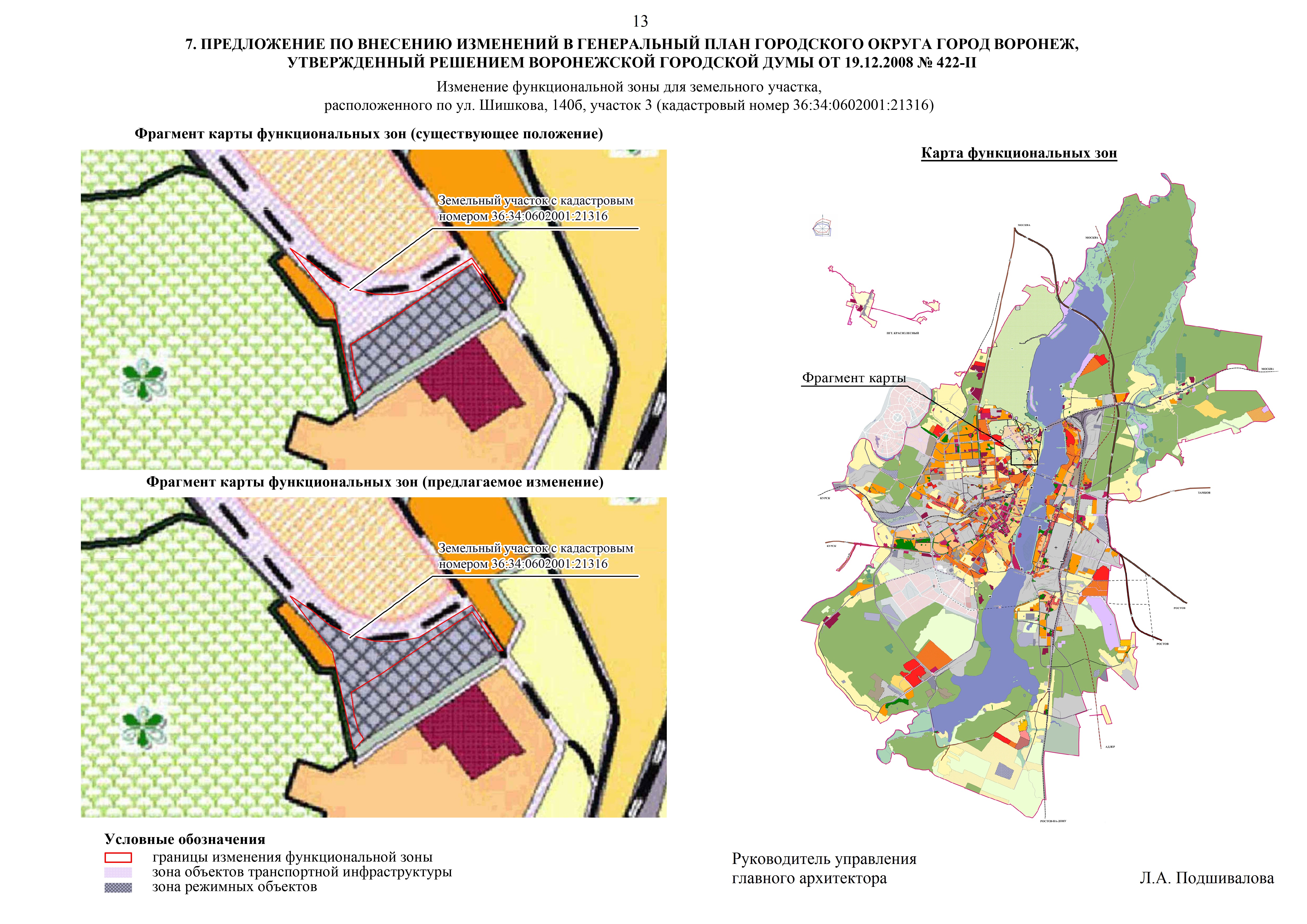 - - по проекту внесения изменений в Генеральный план городского округа город Воронеж в части изменения функциональной зоны объектов транспортной инфраструктуры на функциональную зону режимных объектов для земельного участка, расположенного по ул. Шишкова, 140б, участок 3 (кадастровый номер 36:34:0602001:21316);