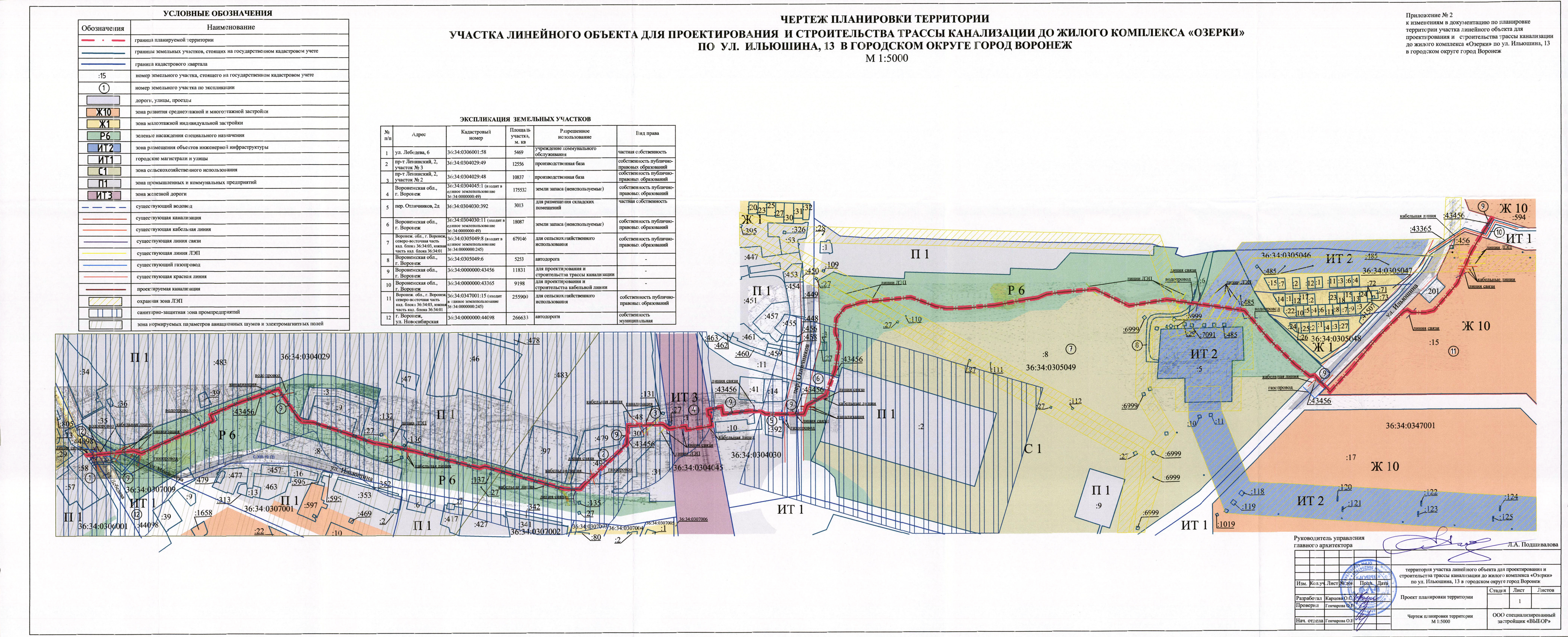 Чертеж планировки территории участка линейного объекта для проектирования и строительства трассы канализации до жилого комплекса «Озерки» по ул. Ильюшина, 13 в городском округе город Воронеж