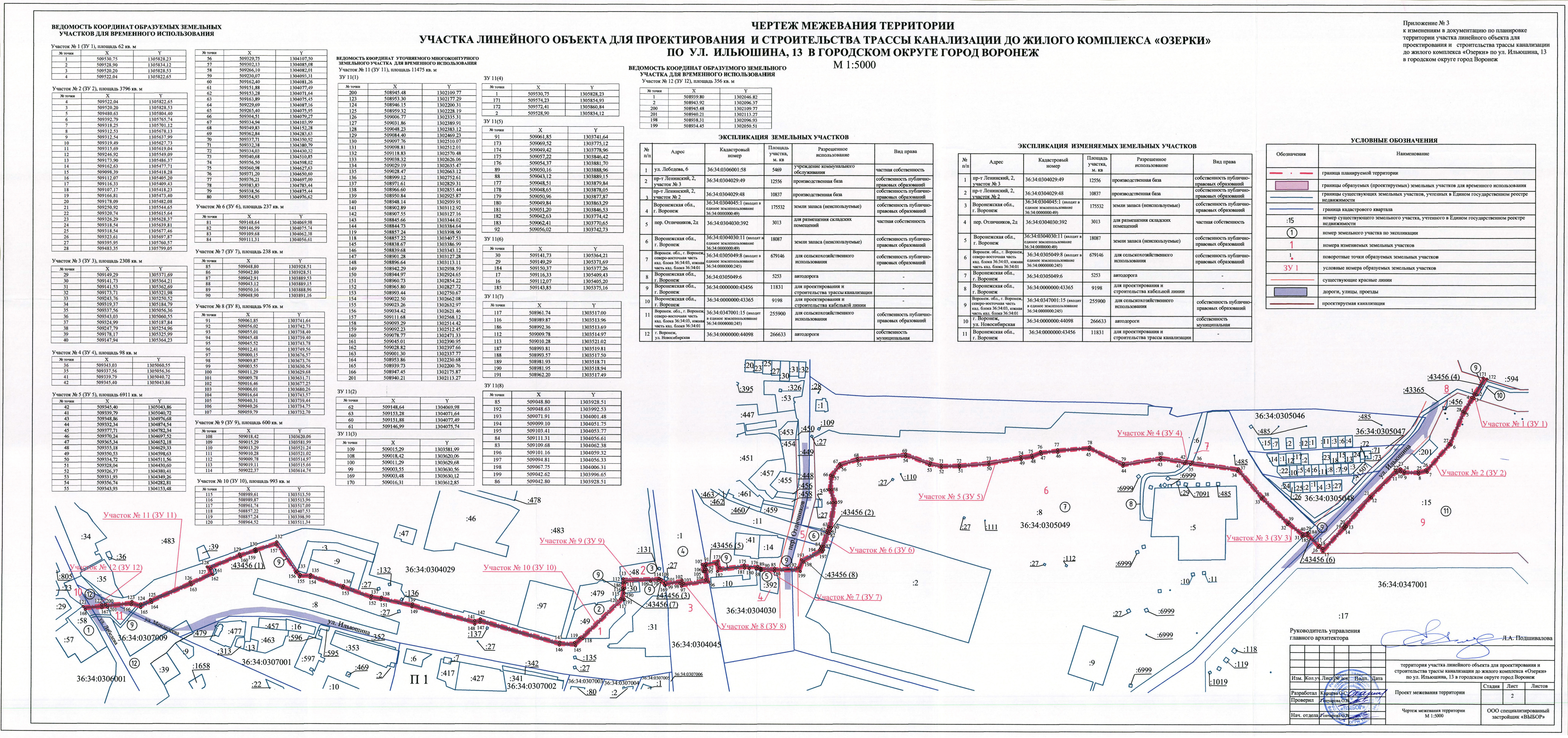 Чертеж межевания территории участка линейного объекта для проектирования и строительства трассы канализации до жилого комплекса «Озерки» по ул. Ильюшина, 13 в городском округе город Воронеж