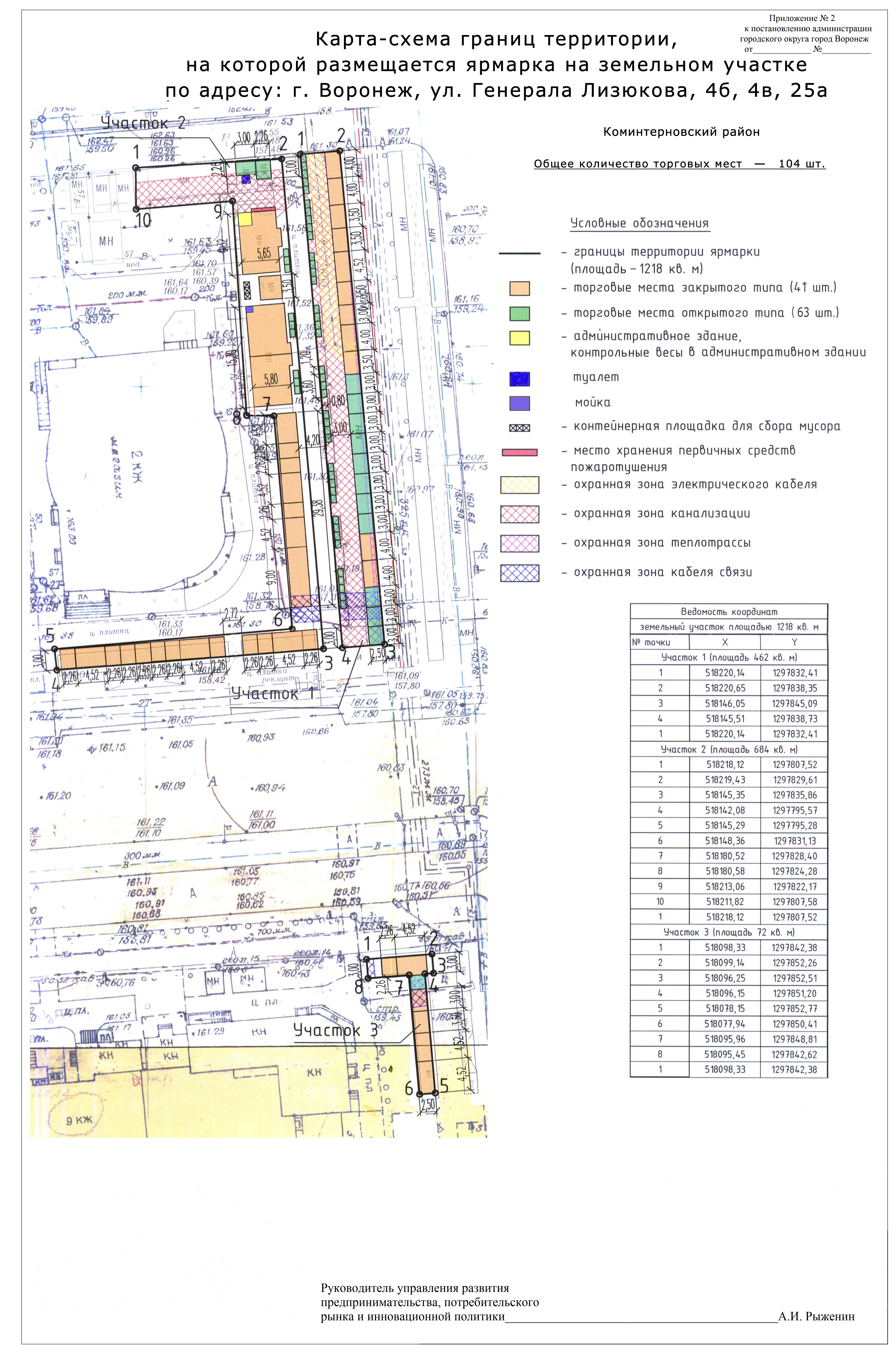3. Карту-схему границ территории, на которой размещается ярмарка на земельном участке по адресу: г. Воронеж, ул. Генерала Лизюкова 4б, 4в, 25а, в Приложении № 2 изложить в новой редакции согласно приложению № 2 к настоящему постановлению.