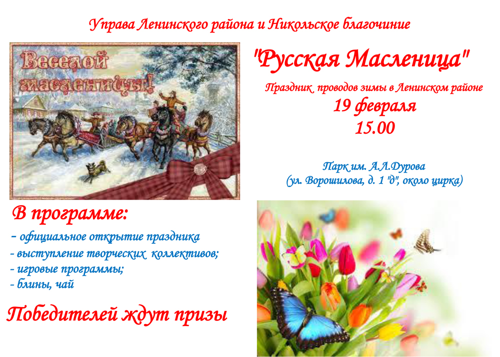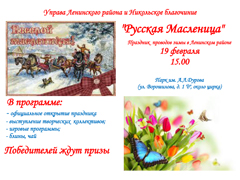 Управа Ленинского района приглашает жителей и гостей города Воронежа на районный праздник проводов зимы – Широкую масленицу.