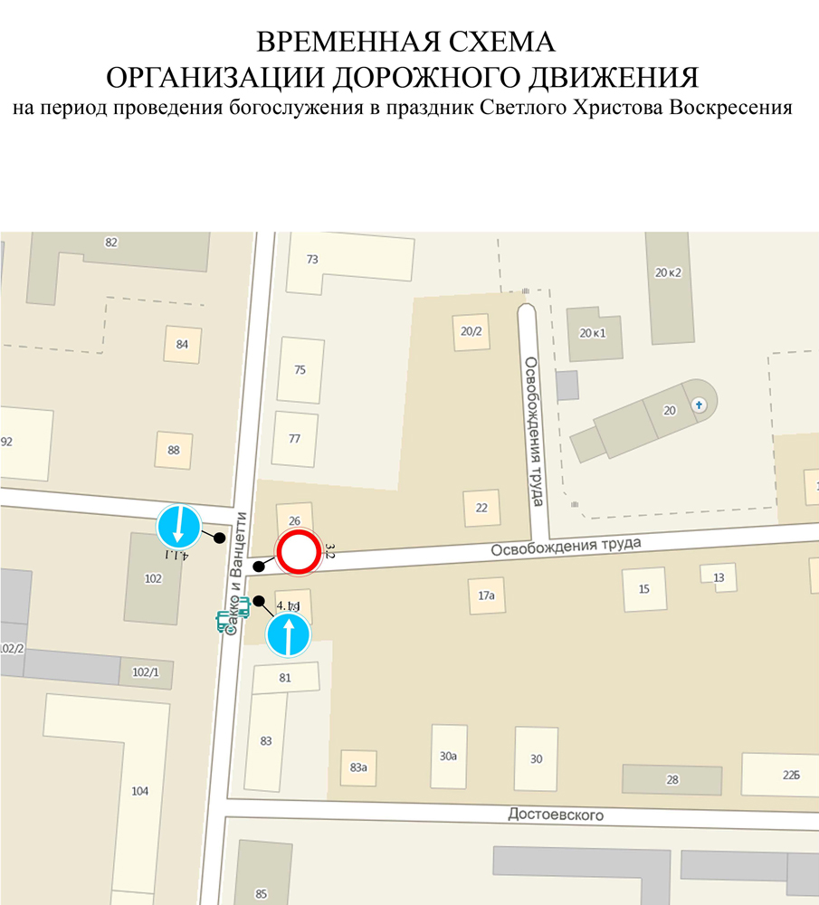 В связи с проведением богослужения в праздник Светлого Христова Воскресения с 22:00 11 апреля до 5:00 12 апреля будет закрыто движение автотранспорта по улице Освобождения труда (от улицы Сакко и Ванцетти).
