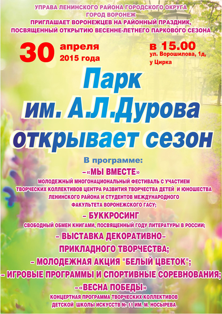 Управа Ленинского района Воронежа приглашает воронежцев и гостей города на районный праздник, посвященный открытию весенне-летнего паркового сезона.