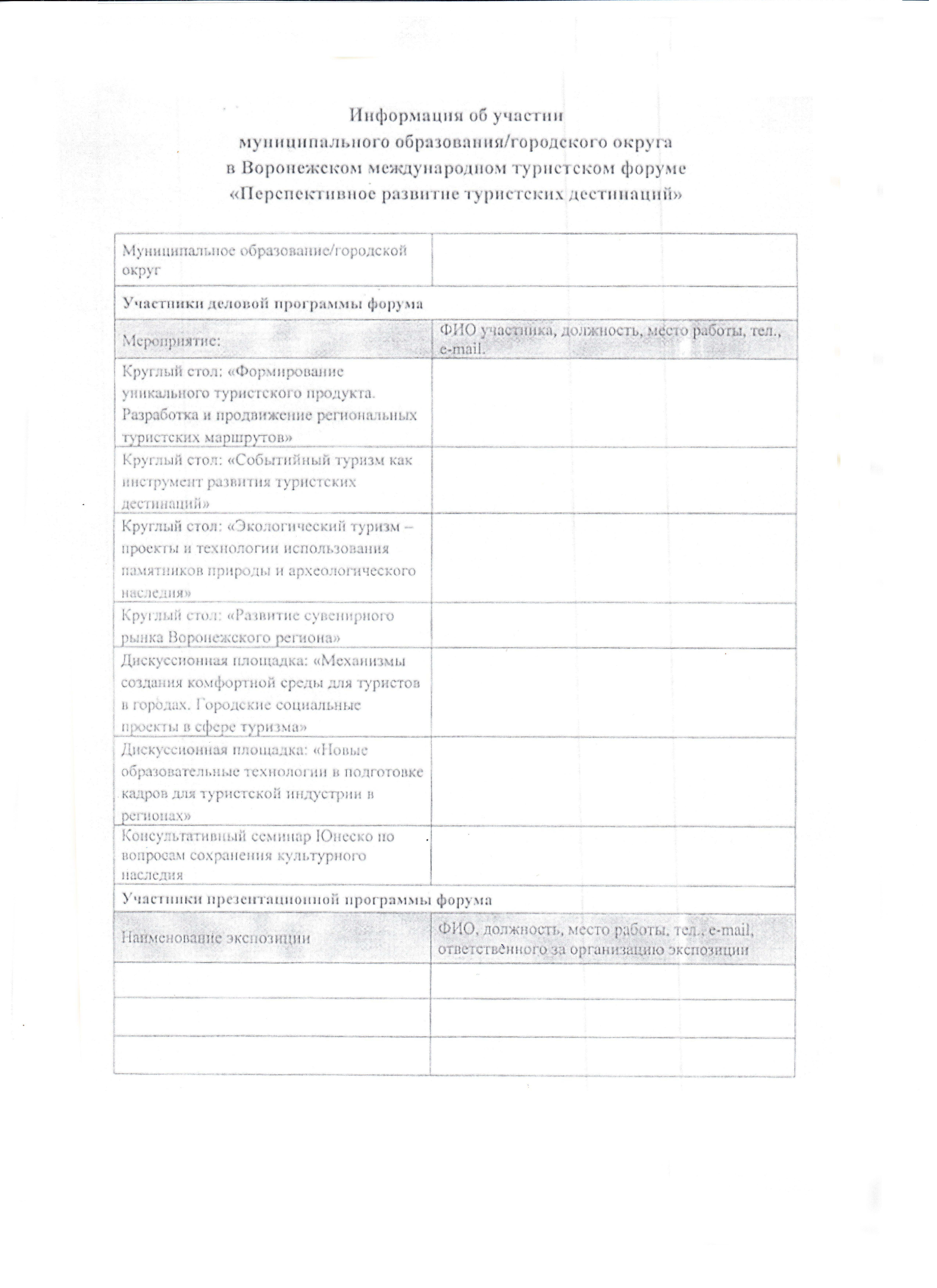 Информацию об участии в Форуме необходимо направить организаторам в срок до 6 мая по адресу: tourism_vo@mail.ru согласно прилагаемой форме.