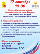 17 сентября управа Ленинского района приглашает воронежцев и гостей города в парк им. А.Л. Дурова на праздник, посвященный Дню города Воронежа