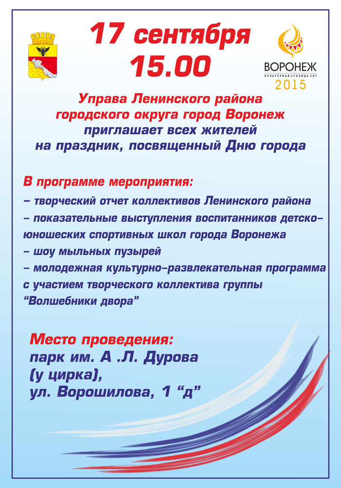 17 сентября управа Ленинского района приглашает воронежцев и гостей города в парк им. А.Л. Дурова на праздник, посвященный Дню города Воронежа