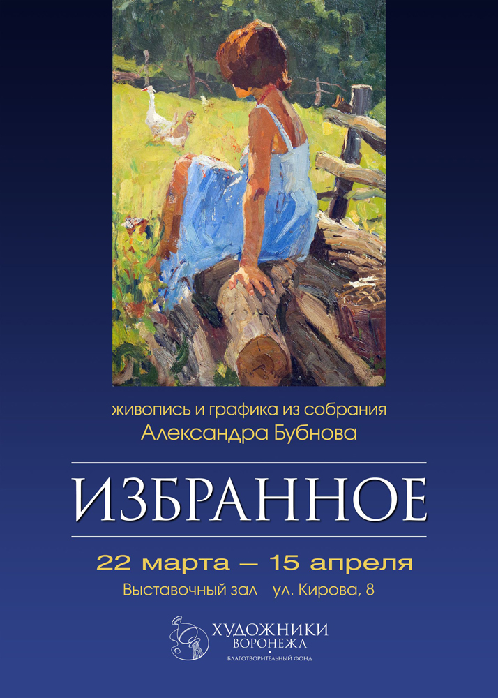 22 марта 2016 года в 17:00 в муниципальном выставочном зале по адресу: ул. Кирова, 8 состоится церемония торжественного открытия выставки «Избранное», организованной при поддержке городского управления культуры меценатом и президентом Благотворительного фонда «Художники Воронежа» Александром Бубновым.