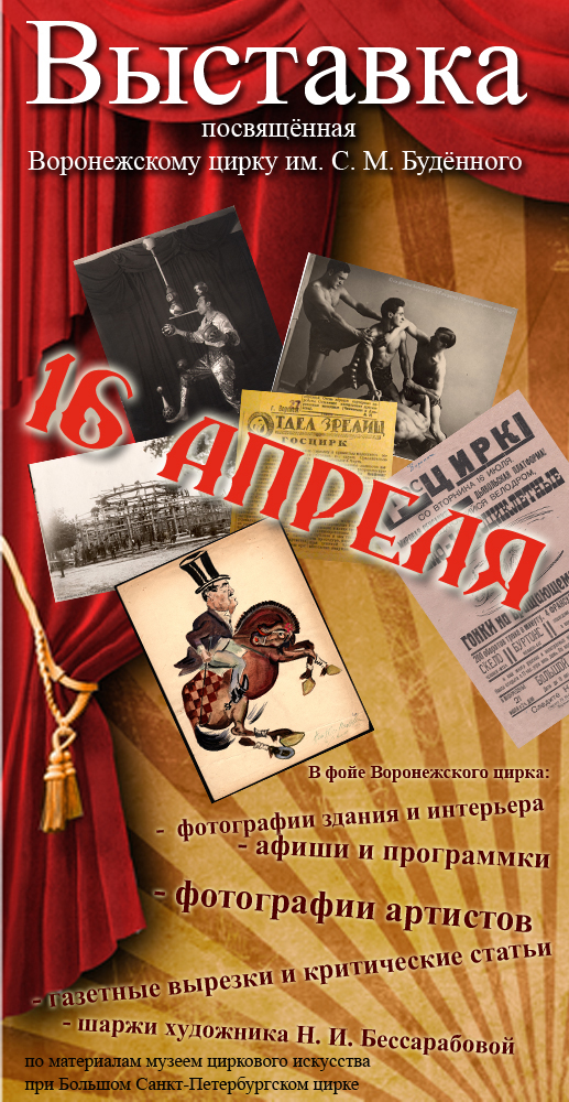 16 апреля на 2 этаже фойе Воронежского государственного цирка имени А.Дурова (ул. 20-летия Октября 121) в 15:00 часов состоится открытие выставки рассказывающей об одном из первых стационарных цирков в Воронеже – цирке им.С.М.Будённого.