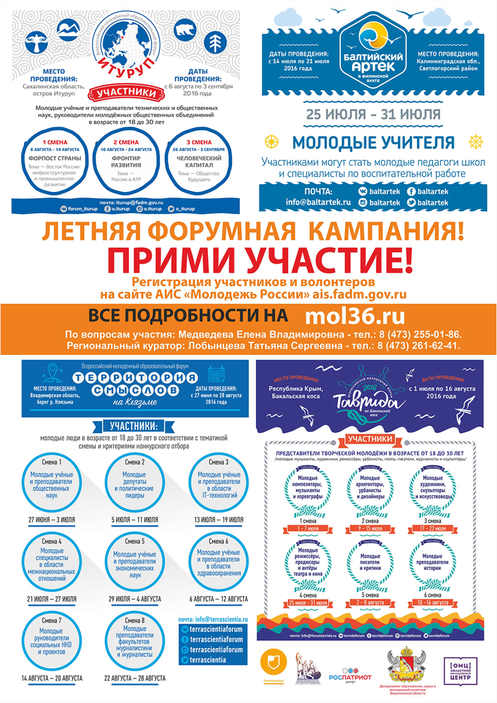 Региональный куратор всероссийских молодежных образовательных форумов – Лобынцева Татьяна Сергеевна, ведущий консультант отдела проектно-программной деятельности в молодежной среде департамента образования, науки и молодежной политики Воронежской области, тел.: 8 (473) 261-62-41.