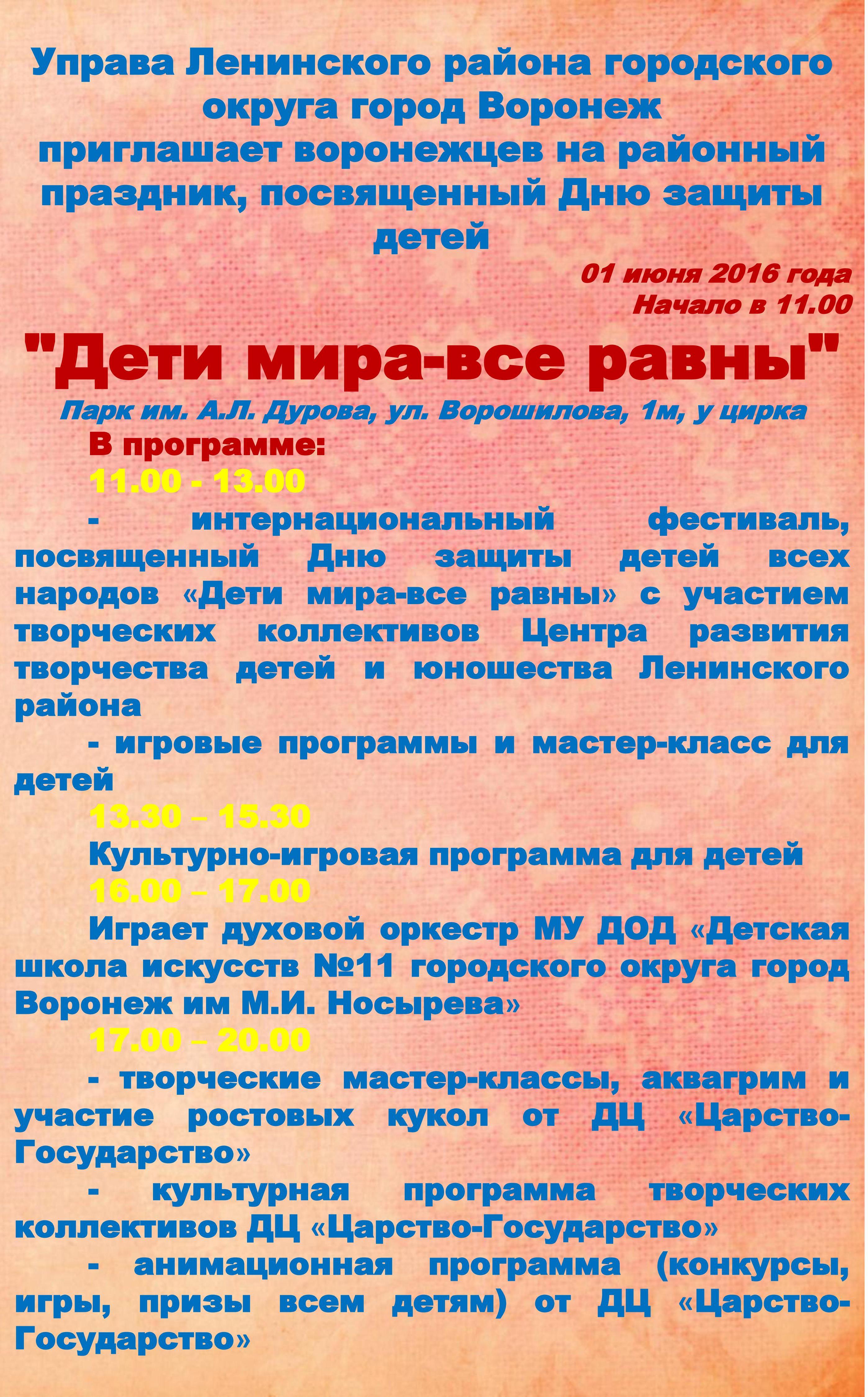27.05.2016Управа Ленинского района городского округа город Воронеж приглашает воронежцев и гостей города 1 июня 2016 года в парк им. А.Л. Дурова (ул. Ворошилова, 1м) на районный праздник, посвященный Дню защиты детей под девизом: «Дети мира – все равны».