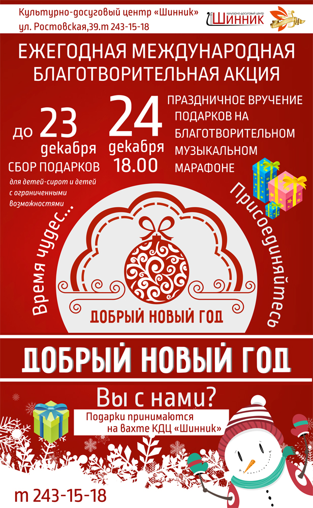 Подарки будут вручены детям Дедом Морозом 24 декабря в рамках благотворительного марафона «Добрый новый год» в Воронеже в КДЦ «Шинник», а также в Гамбурге. Организаторы приглашают к участию в благотворительном марафоне небезразличных людей и организации для сбора средств на нужды учреждений соответствующего профиля Воронежа.