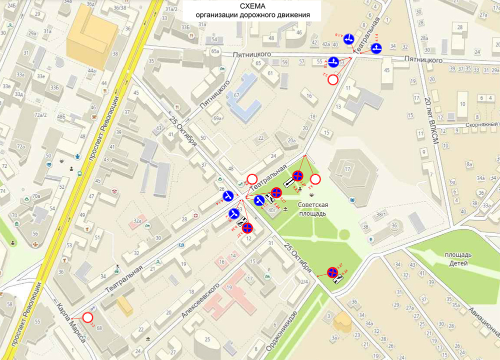 - – 25 февраля с 9:00 до 16:00 будет запрещён въезд на Советскую площадь (со стороны улицы Театральной) и закрыто движение на участке улицы Театральной (от улицы Карла Маркса до улицы Пятницкого).