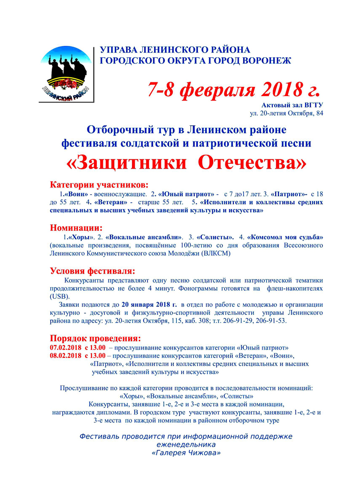 7-8 февраля 2018 г. в студенческом клубе Воронежского государственного технического университета (ул. 20-летия Октября, 84) пройдет отборочный тур в Ленинском районе городского фестиваля солдатской и патриотической песни «Защитники Отечества». Начало в 13.00.