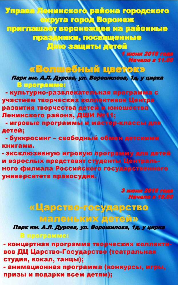 Управа Ленинского района приглашает воронежцев и гостей города в парк им. А.Л. Дурова (ул. Ворошилова, 1д, у цирка) на праздники, посвященные Дню защиты детей