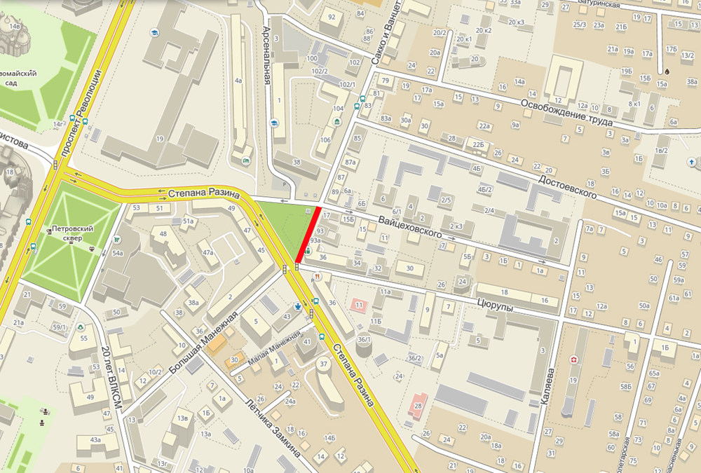 Движение автобусов маршрута № 58в на период производства работ будет направлено с улицы Степана Разина (разворот на пересечении улиц Степана Разина и Сакко и Ванцетти, регулируемый перекрёсток) по улицам Вайцеховского, Сакко и Ванцетти, далее по маршруту.