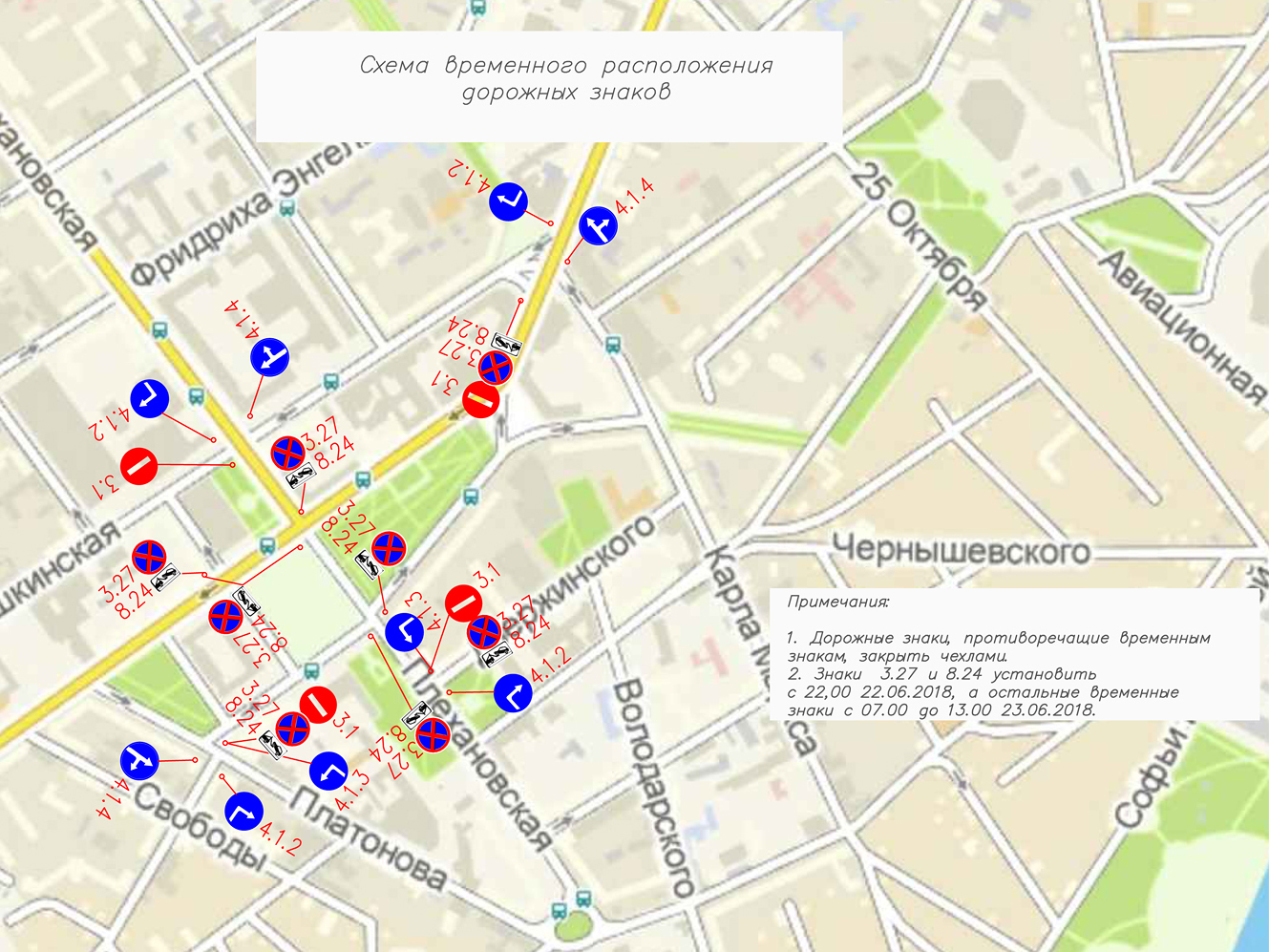 В связи с выпуском офицеров из ВУНЦ ВВС «Военно-воздушная академия профессора Н.Е. Жуковского и Ю.А. Гагарина» 23 июня с 6:00 до 14:00 будут запрещены парковка и движение автотранспорта по площади Ленина (на участках от проспекта Революции до улицы Кирова и от улицы Платонова до улицы Кардашова); проспекту Революции (от улицы Карла Маркса до площади Ленина); улице Плехановской (от улицы Дзержинского до улицы Пушкинской); Театральному проезду (от площади Ленина до улицы Пушкинской).