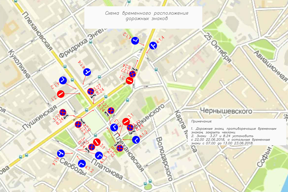 В связи с выпуском офицеров из ВУНЦ ВВС «Военно-воздушная академия профессора Н.Е. Жуковского и Ю.А. Гагарина» 23 июня с 6:00 до 14:00 будут запрещены парковка и движение автотранспорта по площади Ленина (на участках от проспекта Революции до улицы Кирова и от улицы Платонова до улицы Кардашова); проспекту Революции (от улицы Карла Маркса до площади Ленина); улице Плехановской (от улицы Дзержинского до улицы Пушкинской); Театральному проезду (от площади Ленина до улицы Пушкинской).