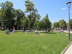 Здесь высадили десятки разнообразных деревьев. У каждого типа растения будет свое цветение в определенное время. Они сменяют друг друга, и площадь становится цветной, несмотря на то, что она монохромная.