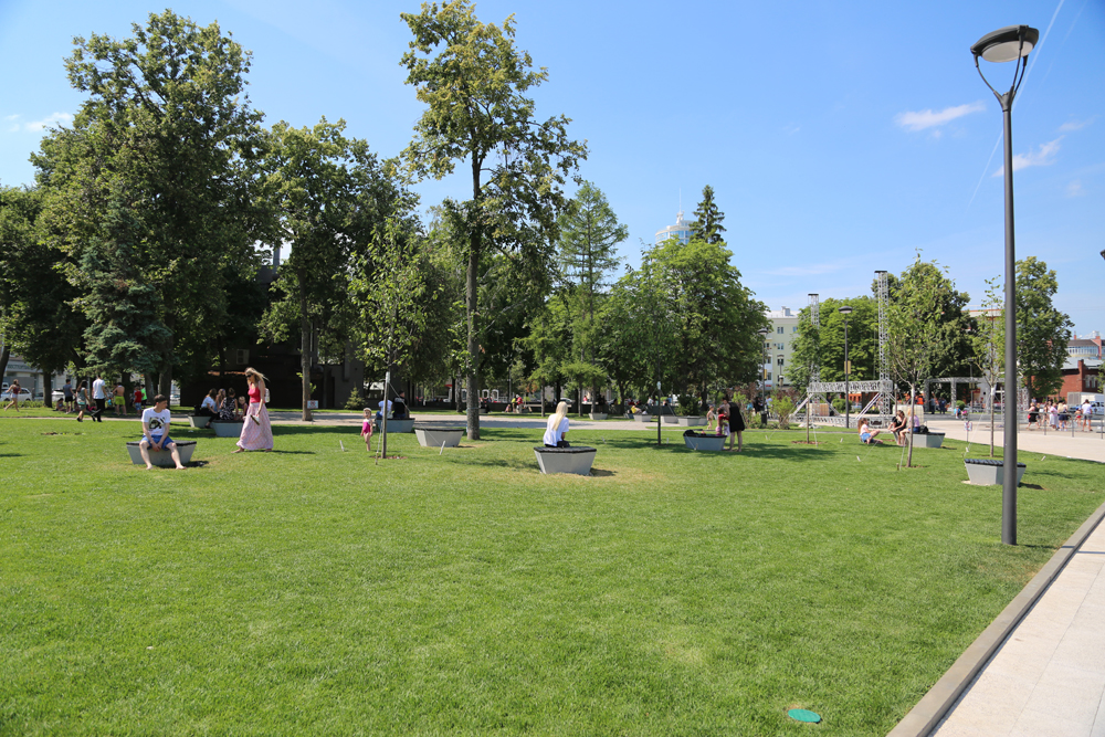 Старые массивные бетонные скамейки заменили на новые, из архитектурного бетона, с деревянными настилами из твердых пород древесины. На площади также смонтировали системы наружного видеонаблюдения, автоматического полива, установили дополнительные малые архитектурные формы. Площадь удобна для людей с ограниченными возможностями: там, где есть ступеньки, архитекторы продумали альтернативный вариант дорожек с плавными перепадами высот.