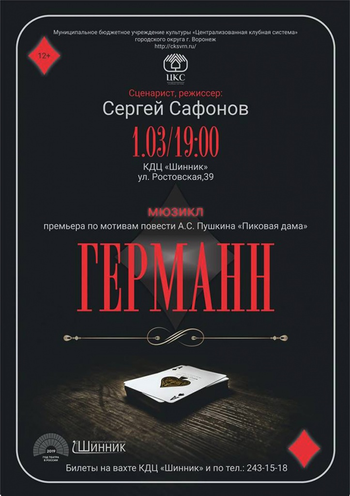 2019 год объявлен Годом Театра в России и ознаменован 220-летием со Дня рождения автора повести «Пиковая дама» Александра Сергеевича Пушкина, по мотивам которой и поставлен мюзикл. Именно поэтому «Германн» будет хорошим стартом для плодотворной творческой работы в течение года.