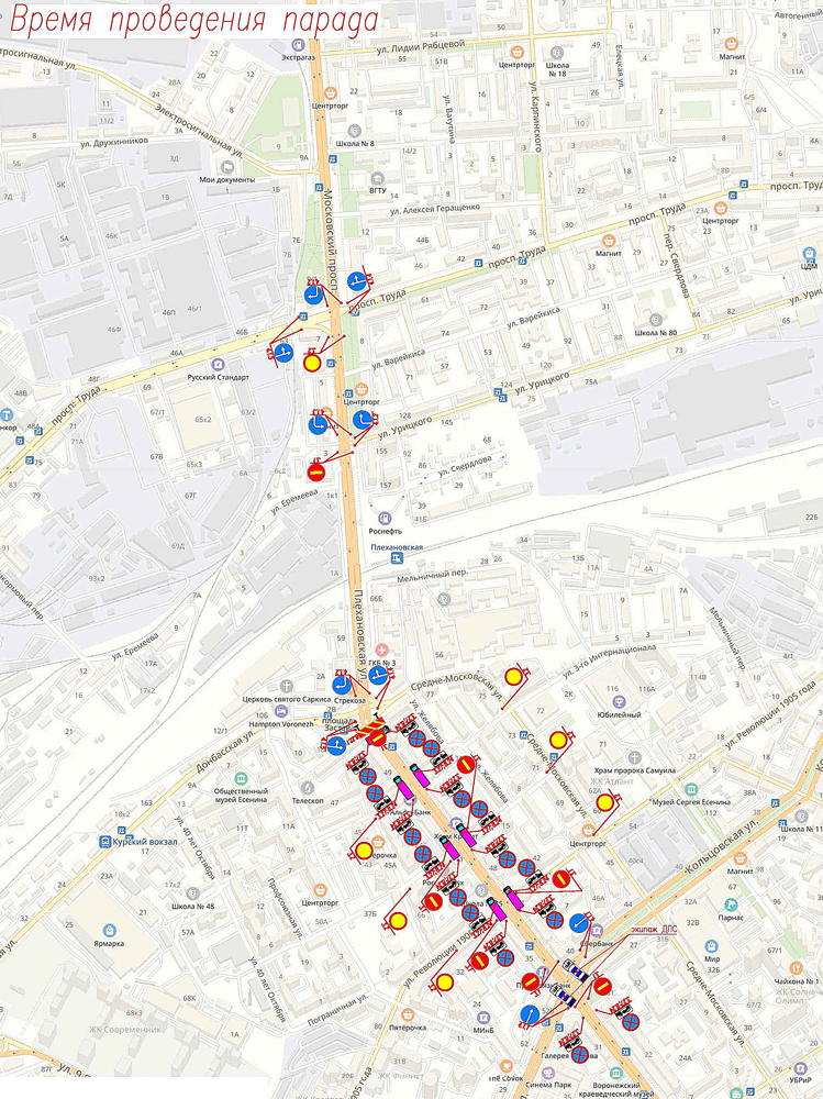 - – с 23:00 1 мая до 13:00 2 мая и с 23:00 3 мая до 13:00 4 мая будут запрещены парковка и движение автотранспорта по площади Ленина; проспекту Революции (от площади Ленина до улицы Степана Разина); улицам Кирова; Плехановской (от улицы Кольцовской до Университетской площади); Пушкинской (от проспекта Революции до улицы Плехановской);