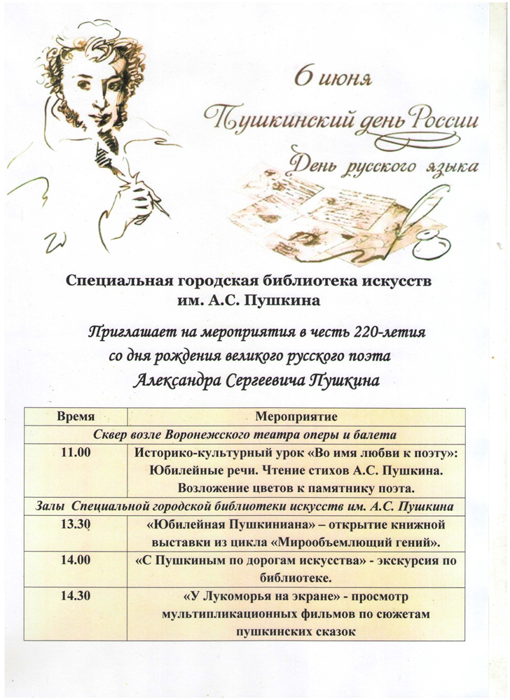 6 июня Специальная городская библиотека искусств им. А.С. Пушкина приглашает на мероприятия, посвященные Пушкинскому дню России.