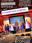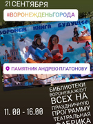 Новой программой под таким названием Библиотеки Воронежа приглашают отметить 433-летие любимого города. Премьера состоится 21 сентября в День города у памятника Платонову и будет посвящена Году театра и 120-летию со дня рождения писателя. Время действия с 11.00 до 16.00