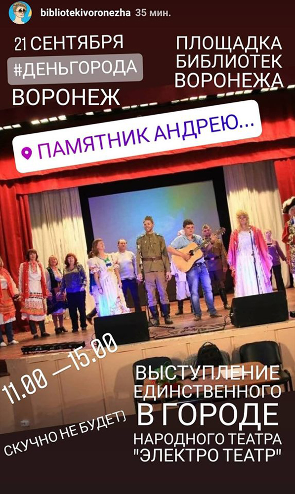 С 11.00 до 16.00 на импровизированной сцене у памятника А. Платонову будет работать приглашенный гость программы - Воронежский «Электро Театр» (клуб ОАО «Электросигнал»), обладатель почётного звания Народный самодеятельный коллектив Воронежской области. Художественный руководитель Д.В. Жердев-Дубровский.