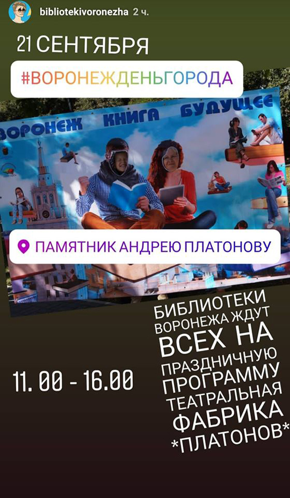 Новой программой под таким названием Библиотеки Воронежа приглашают отметить 433-летие любимого города. Премьера состоится 21 сентября в День города у памятника Платонову и будет посвящена Году театра и 120-летию со дня рождения писателя. Время действия с 11.00 до 16.00