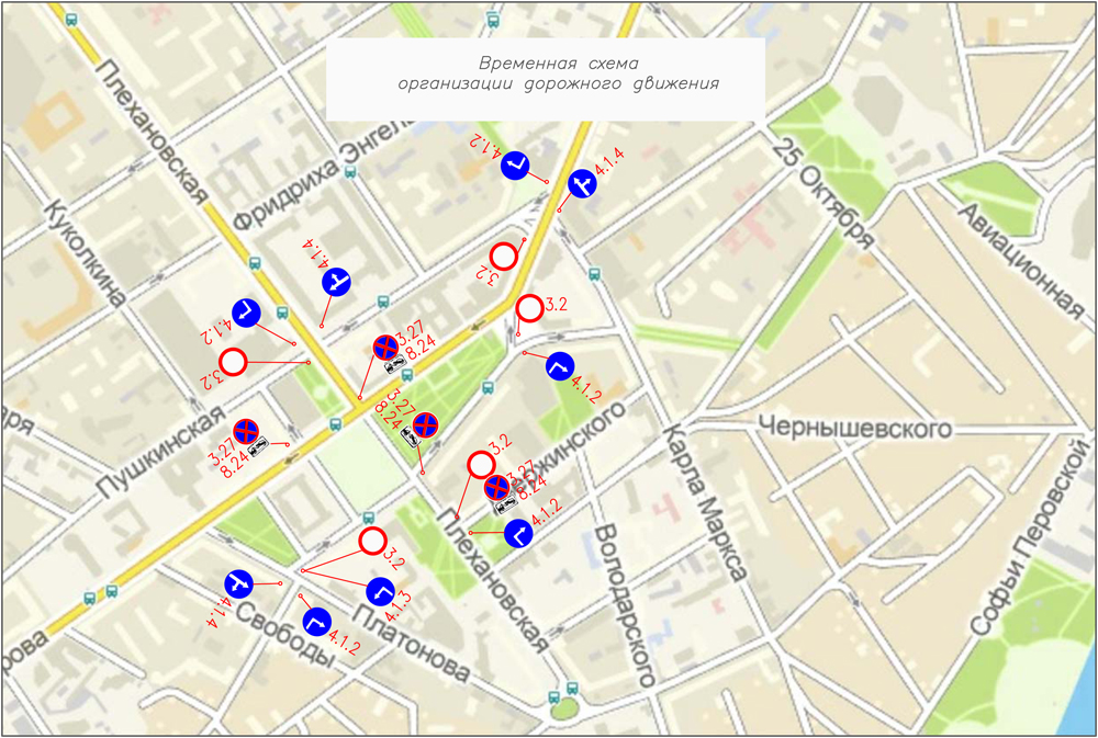 - – № 25а – с улицы 20 лет Октября по улицам Фридриха Энгельса, Феоктистова, проспекту Революции, далее по маршруту; в обратном направлении – с проспекта Революции по улицам Пушкинской, Красноармейской, Кирова, 20 лет Октября, далее по маршруту;