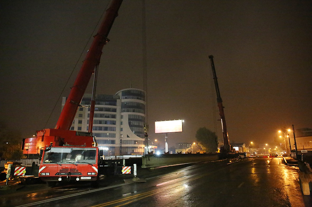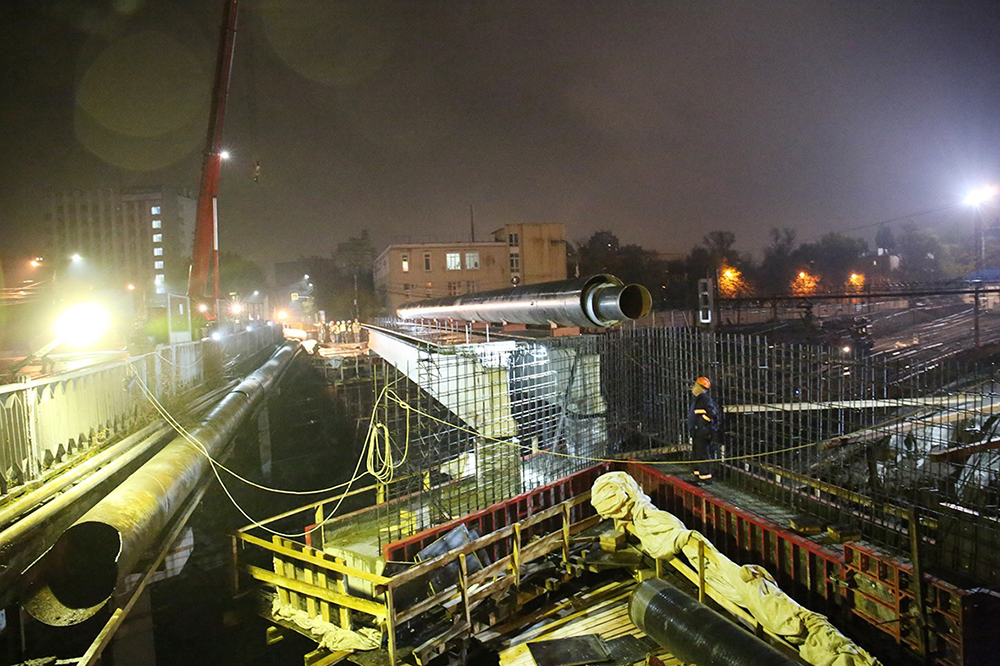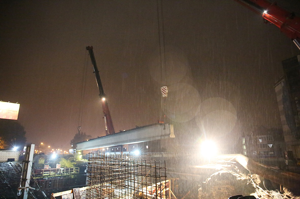 После 0:45 железнодорожники, также присутствовавшие на объекте, дали разрешение на проведение работ по монтажу балок. К 3:00 подрядная организация успешно осуществила монтаж 2 балок пролетного строения на эстакаду и произвела монтаж трубы водовода на эстакаду.