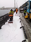 Производился вывоз снега с проезжей части Северного моста, работники ручными щетками очистили его пешеходнуючасть.