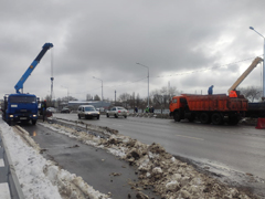 Сейчас подрядная организация ведёт работы по демонтажу временных бетонных и водоналивных блоков.После этого районный комбинат благоустройства Ленинского района произведет уборку снега с проезжей части и его вывоз.