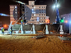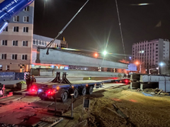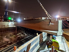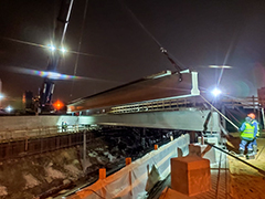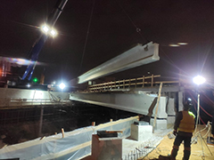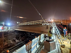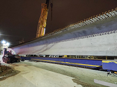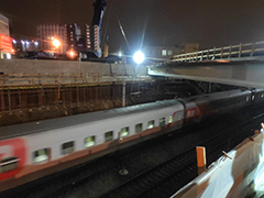 В планах на эту ночь был монтаж трех балок пролетного строения. Все подготовительные работы как обычно были проведены заранее: балка застроплена, балковоз готов сразу же подать следующую. Работы начались сразу же после того как в 1:02 прошел поезд. Около 3:00 монтаж, как и планировалось, трех балок (в общей сложности с учетом прошлой ночи уже пяти балок) был завершен, поскольку для дальнейших работ крану требуется передислокация. В течение дня кран будет передислоцирован, завтра ночью монтажные работы на путепроводе продолжатся.