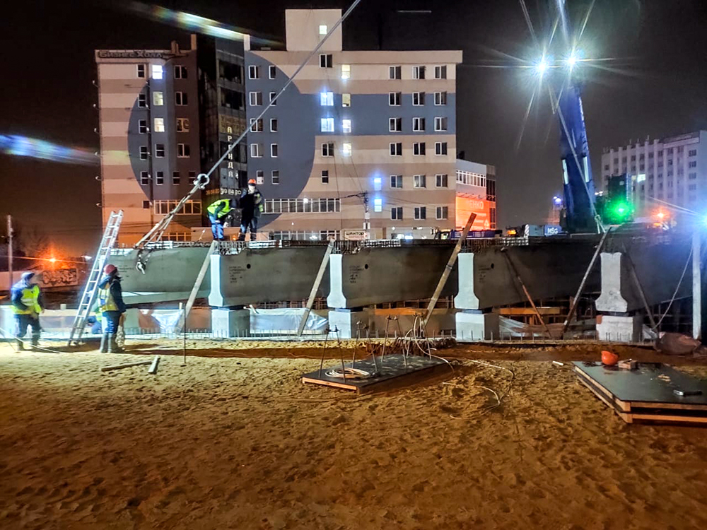 В планах на эту ночь был монтаж трех балок пролетного строения. Все подготовительные работы как обычно были проведены заранее: балка застроплена, балковоз готов сразу же подать следующую. Работы начались сразу же после того как в 1:02 прошел поезд. Около 3:00 монтаж, как и планировалось, трех балок (в общей сложности с учетом прошлой ночи уже пяти балок) был завершен, поскольку для дальнейших работ крану требуется передислокация. В течение дня кран будет передислоцирован, завтра ночью монтажные работы на путепроводе продолжатся.