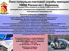 Полк патрульно-постовой службы полиции УМВД России по городу Воронежу проводит отбор кандидатов на службу в ОВД на должности: полицейского, полицейского-водителя, полицейского-кинолога, полицейского-кавалериста.Основные требования к кандидатам: