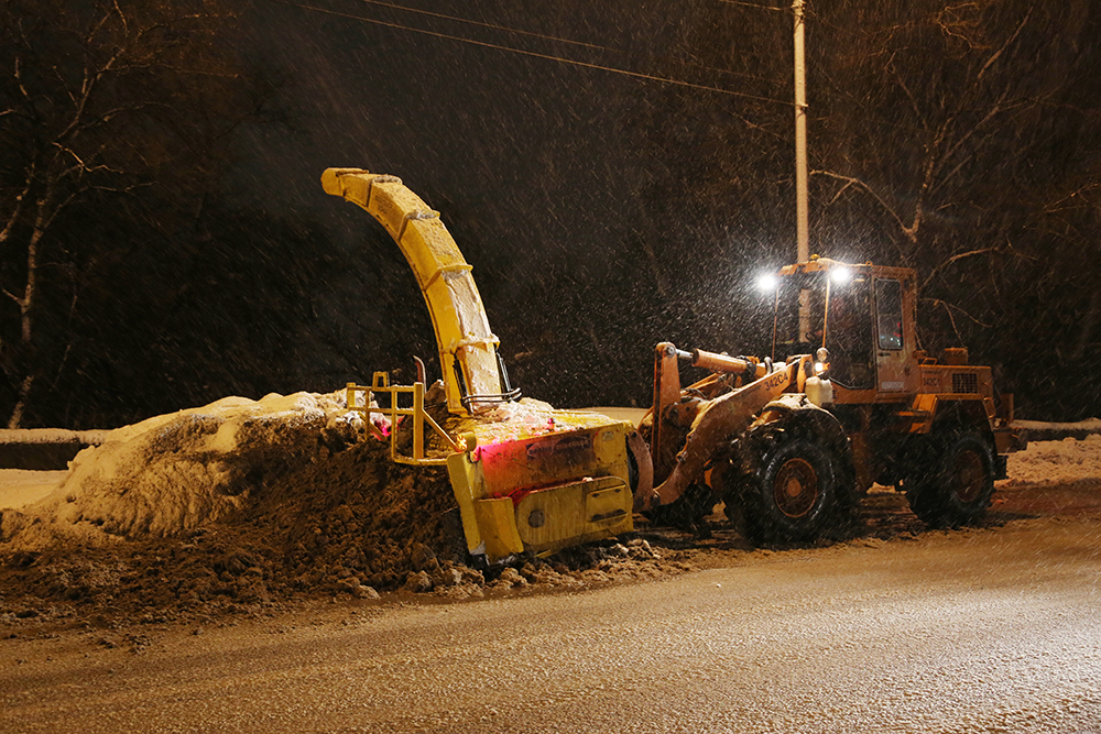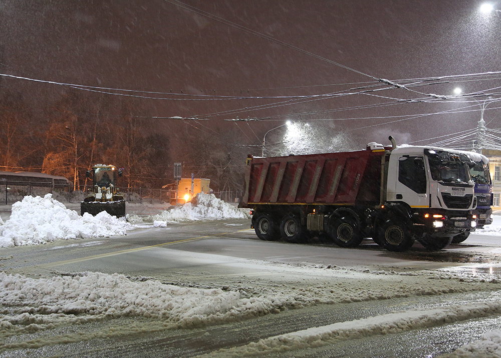Задачу обеспечить массовый вывоз снега с городских улиц поставил мэр Вадим Кстенин. В связи с прогнозируемым понижением температуры это была первоочередная работа комбинатов благоустройства в минувшую ночь наряду с обычными циклами обработки проезжих частей и тротуаров противоголедными реагентами (за прошедшую ночь было израсходовано 1866 тонн песко-соляной смеси). Вечером, пока движение транспорта было интенсивным, на улицах города работало 165 единиц уборочной техники. К ночи, когда трафик снизился, выход спецмашин был значительно увеличен – до 220 единиц. В том числе, работали почти 3 десятка погрузчиков и около 70 самосвалов, в результате из города вывезли 7670 кубометров снега.