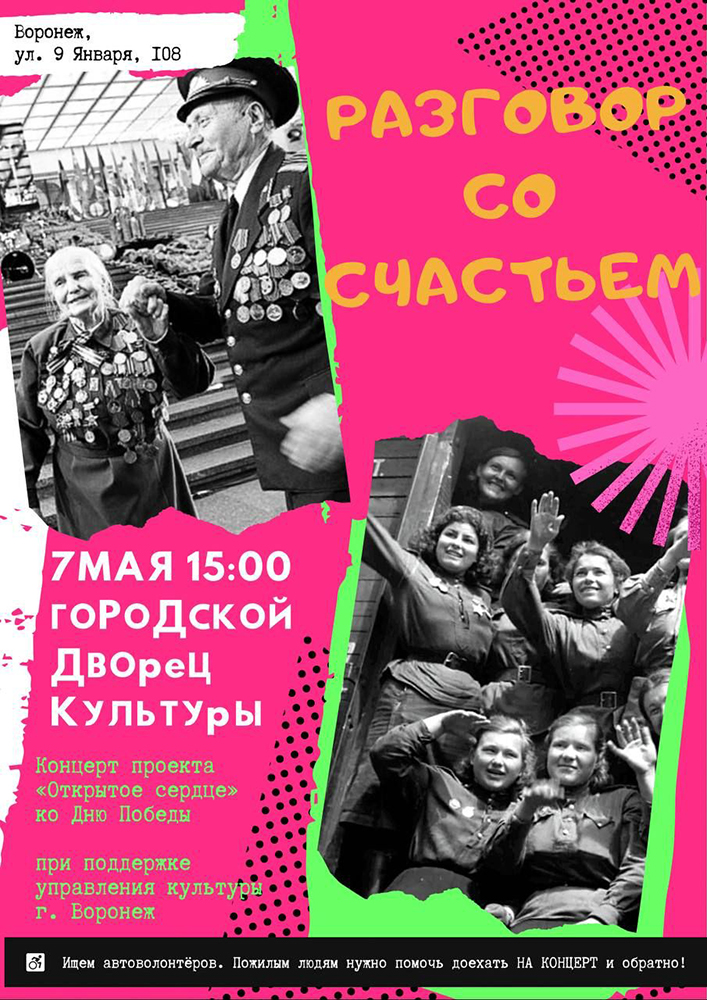 - Сейчас как никогда нашим дорогим и заслуженным людям нужны тепло и забота. Мы хотим сделать подарок нашим дорогим бабушкам и дедушкам, пусть они вспомнят молодость и погрузятся в атмосферу радости и любви. Любимые песни «Журавли», «Эхо любви», «Смуглянка», «Этот мир», «Синий платочек», «Ходит песенка по кругу», а так же зажигательные танцы от «Яблочка» и «Барыни» до «Майского вальса», подарят прекрасное настроение, и этот предпраздничный день станет ярким событием, - говорят организаторы концерта.Автоволонтеры готовы помочь довезти ветеранов до Городского Дворца культуры и обратно. Для этого необходимо направить заявку на электронную почту open.heart.vrn@mail.ru.