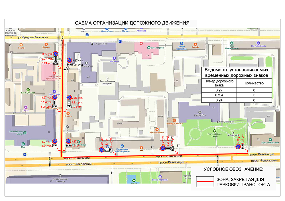 - - с 7:00 до 16:00 17 мая – на участке проспекта Революции (от дома № 22 по проспекту до улицы Комиссаржевской) и улицы Комиссаржевской (от проспекта Революции до Фридриха Энгельса).